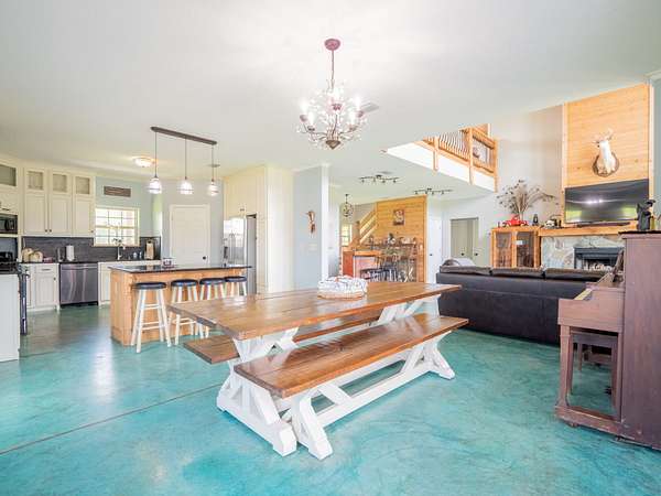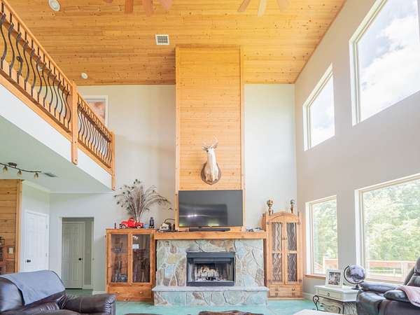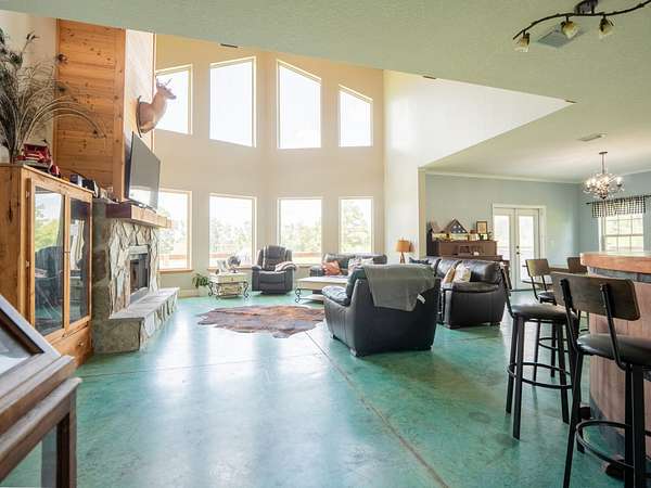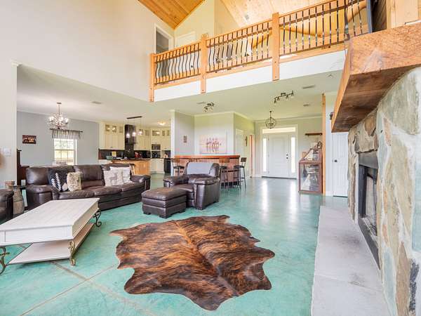 Inside, you'll find a spacious 4-bedroom, 3.5-bathroom layout with soaring vaulted cypress ceilings, a striking stone fireplace, and an abundance of natural light pouring in from the floor-to-ceiling windows overlooking a tranquil pond and rolling pasture.