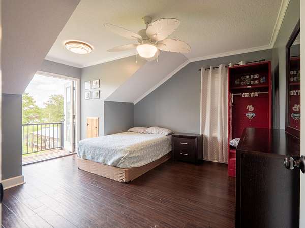 Upstairs, the primary suite opens through French doors to a private balcony with pond views. The luxurious ensuite includes a custom walk-in shower and soaking tub. Also upstairs, you will find two additional bedrooms, plus a flex space- providing ample room for family, guests, or a home office. One of the guest rooms also features its own private balcony overlooking the pond.