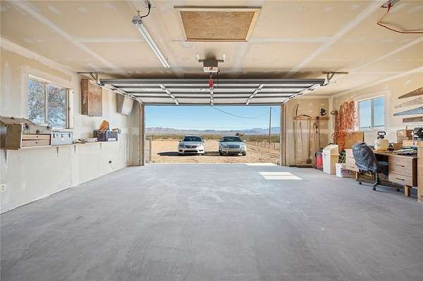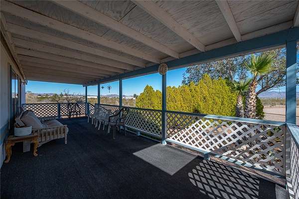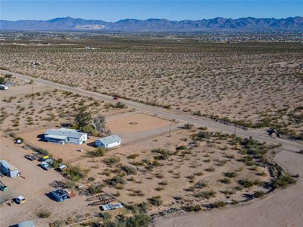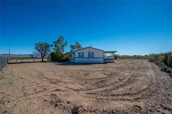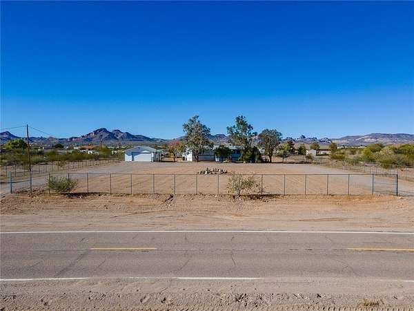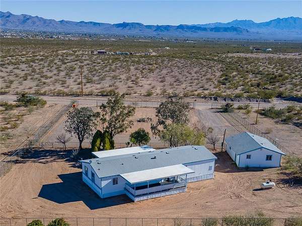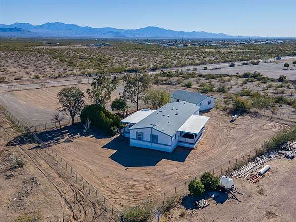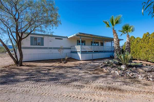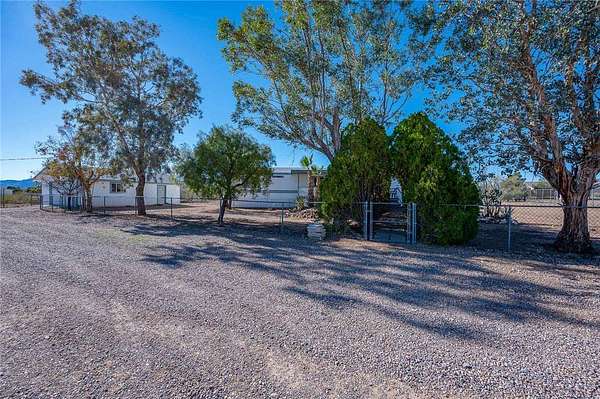 This 3 bedroom 3 bath double wide sits on paved Estrella Road with 2.2 fully fenced acres (1.1 acre homesite plus the southern 1.1 acre parcel included), large driveway, detached 2 car garage with workshop and storage area, and great mountain views from the spacious covered front and back porches. The 1621 sq foot home features a split floor plan with two primary suites each with attached bathrooms, vaulted ceilings, and dramatic juniper lined entry walkway. Recent updates include 3 year old roof and 5 year old HVAC system making this truly move in ready. No HOA restrictions means freedom for your RV, toys, or animals. Two additional adjacent 1.1 acre parcels are available for purchase with one already having a water meter installed for future expansion possibilities. Located in Golden Valley just minutes from Kingman shopping and services or head west to the Colorado River for boating and casinos. Priced to sell fast at this price point with all the extras included.