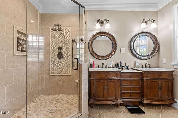 - Bathtub/Shower Combination, Breakfast Bar, Ceiling Fan(s), Crown Molding, Double Vanity, Dual Closets, Eat-In Kitchen, Kitchen Island, Pantry, Primary Downstairs, Quartz Counters, Smooth Ceilings, Sound System, Walk-In Closet(s), Walk-In Shower, Water Closet