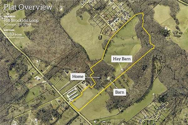 Est $9,068/moOver 70 acres of fully-fenced, income-producing farmland with gently rolling pastures, two barns and long countryside views. Property includes a custom 4BR/2BA Cape Cod with 3/4 wrap-around porch, hardwood floors, and detailed craftsmanship. Ideal for homestead, working farm, or subdivision into a compound of beautiful large estate lots. Convenient Jefferson location with endless potential. No Owner/Creative Financing.