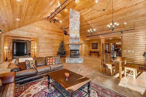 Outdoor features include a stocked private pond, 117' refinished deck spanning the back of the home, and peaceful water frontage. Additional highlights include water rights, well and septic, fenced dog run, and a 3-car garage with dedicated tool room.