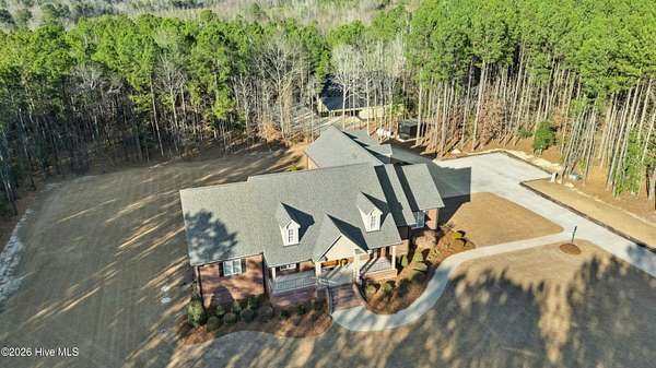 A rare gated estate on 9+ private acres in Wilson County on the Nash County line convenient to Wake County. A dramatic quarter-mile paved driveway winds through rolling woods to a secluded, all-brick, one-level home set on a cleared acre. The split-bedroom layout offers a private office (or optional fourth bedroom), custom cabinetry throughout, and a striking stone fireplace. The owner's suite is a true spa-level retreat, featuring heated tile floors, and a luxury steam shower with aromatherapy and Chroma therapy, multiple shower heads and body sprays, dual tankless water heaters, and a freestanding soaking tube designed for everyday luxury. Additional features include a screened porch, heated and cooled 3-car garage with walk-up unfinished attic space, whole-house generator, crawlspace includes dehumidifier & vapor barrier, advanced water treatment, and a security system with phone-controlled garaged doors and alarm access. A major highlight is the custom barndominium-style entertainment barn, featuring beautiful interior wood siding, high-bay RV/equipment storage, a separate workshop with cabinetry and workbench, full bathroom, covered porch, and massive lean-to ideal for hobbies, business use, or entertaining. This property blends privacy, performance, and lifestyle perfect for buyers seeking land, luxury, and Wake County access without sacrificing space or security. Showings begin soon.