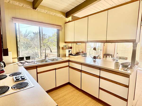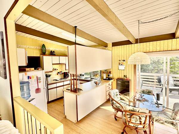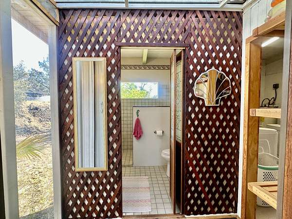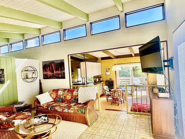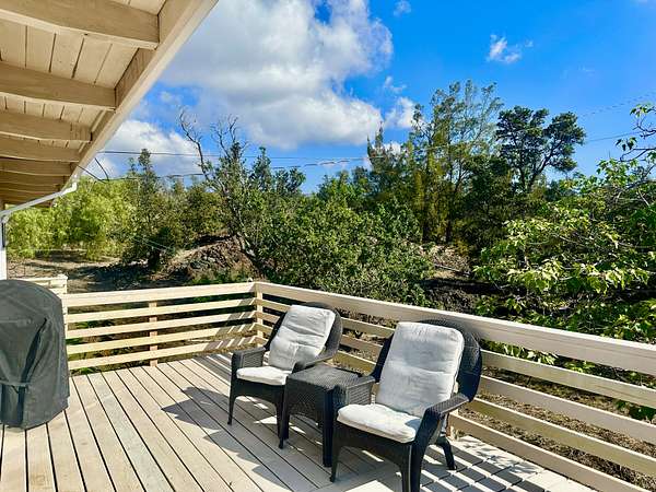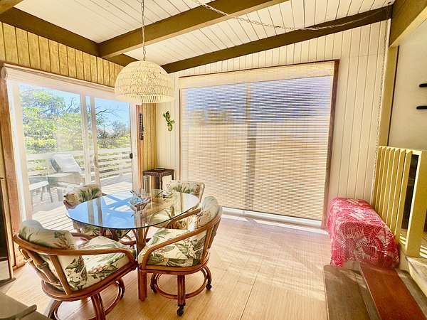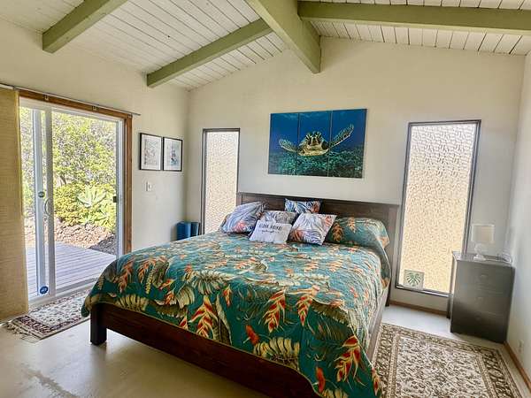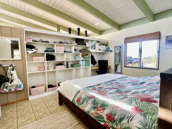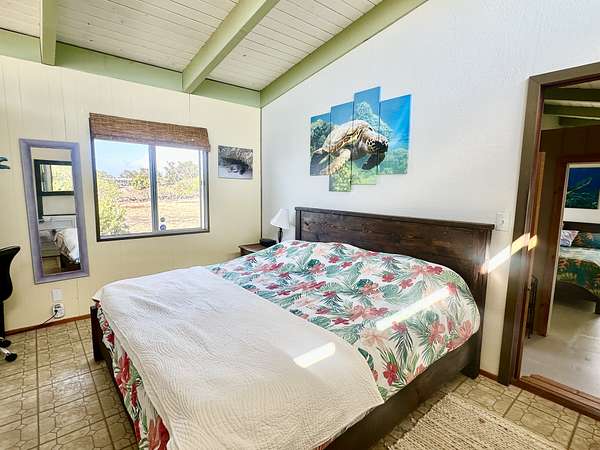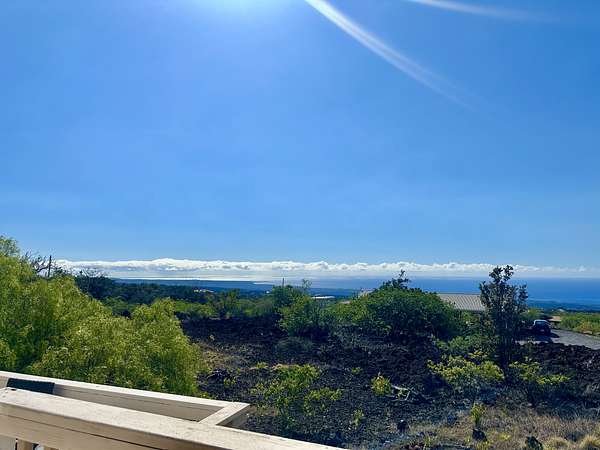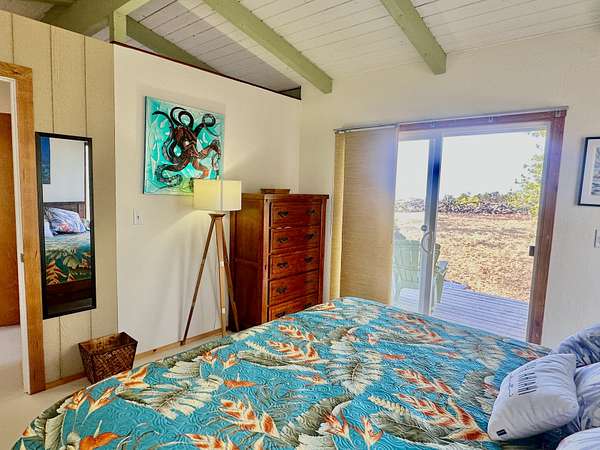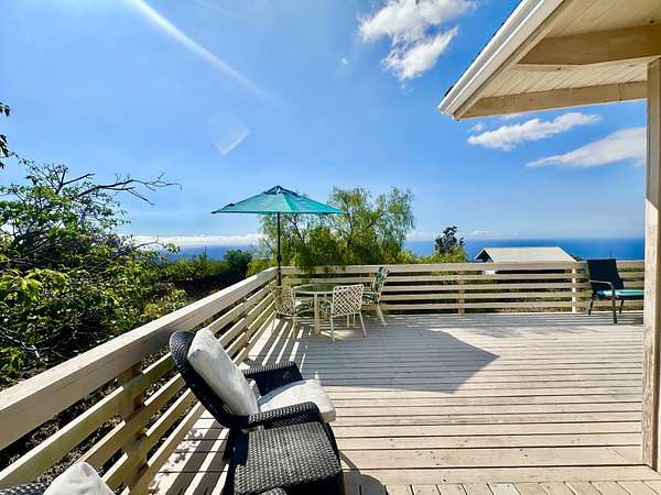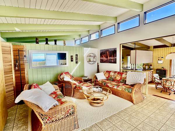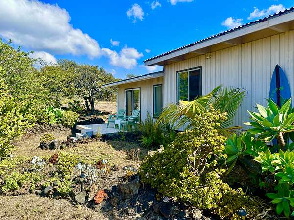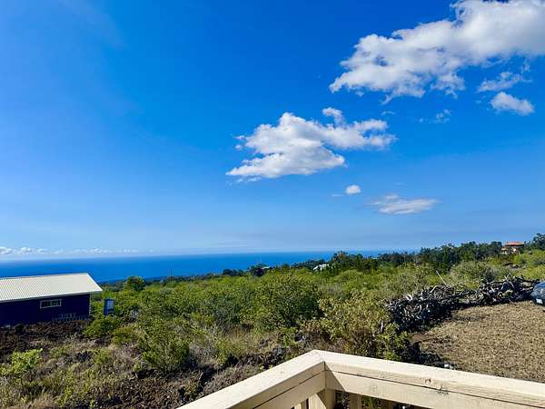 Experience the best of Hawaii living with this charming 2-bedroom, 1-bath Hawaiian cottage set on approximately 3 private acres in Hawaiian Ocean View Ranchos. Tucked well back from the road behind a gated entry, this peaceful retreat offers exceptional privacy, gentle trade winds, and a welcoming neighborhood where neighbors look out for one another. The home features expansive wraparound lanais with sweeping ocean views, perfect for entertaining, sunset watching, or relaxing with morning coffee. A second lanai off the primary bedroom creates a private outdoor escape. The spacious front lanai includes a dedicated barbecue area, ideal for indoor-outdoor island living. Inside, open-beam ceilings create an airy feel throughout the living and dining areas, enhanced by abundant windows that frame ocean and garden views. A custom built-in Murphy bed provides flexible guest accommodations. The kitchen is well appointed with a pass-through counter for entertaining, and an adjacent walk-through area with washer, dryer, and additional storage. Both bedrooms are thoughtfully set apart for privacy and feature garden views, with ocean glimpses from the nearby deck. A large walk-in closet adds convenience. Outside, the property offers multiple cleared areas for gardening, planting, or simply enjoying the natural surroundings. Native trees, open spaces, and cool trade winds make this an ideal setting for hammocks, gardens, and peaceful outdoor living. The home is turnkey and move-in ready, offered furnished with Hawaiian-style rattan furniture, custom wooden bed frames, and more. A perfect opportunity to enjoy privacy, tranquility, and the true Hawaii lifestyle.