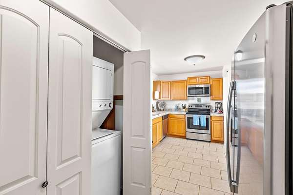 - Dishwasher, Gas Cooktop, Microwave Hood, Range, Refrigerator, Washer/Dryer Stacked