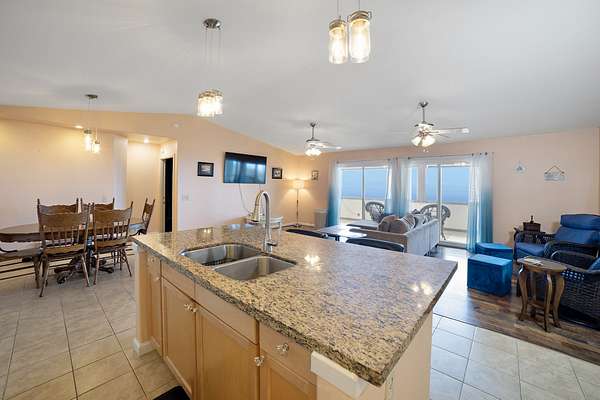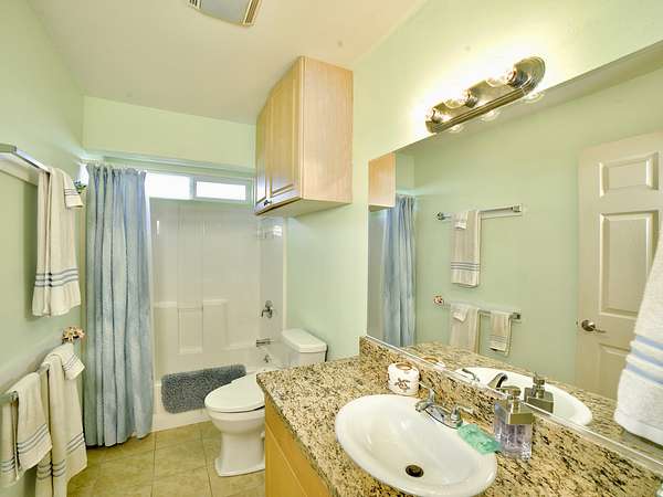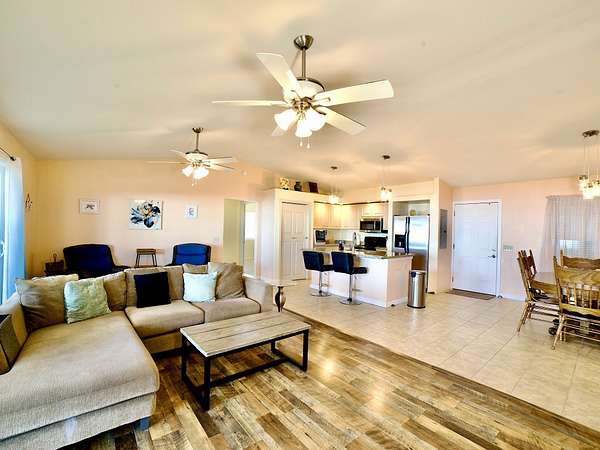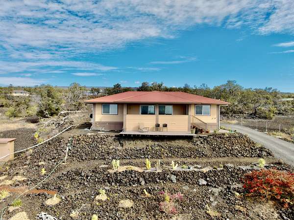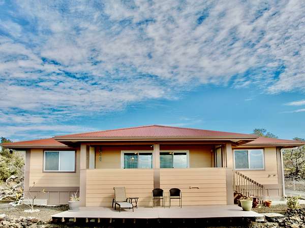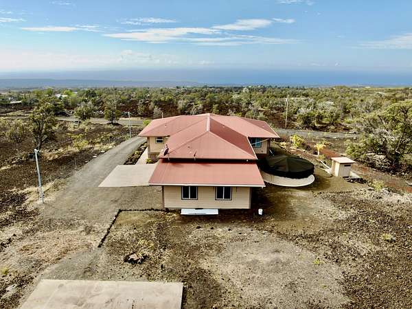 Experience refined Big Island living in this immaculate, turnkey furnished 3-bedroom, 2-bath residence set on three expansive acres in Hawaiian Ocean View Ranchos. This impeccably maintained, modern island home feels nearly new and is positioned near the top of the subdivision, where cooler temperatures, gentle trade winds, and breathtaking coastline and ocean views define the setting. Vaulted ceilings and an open, light-filled floor plan create an immediate sense of space and sophistication. The beautifully appointed kitchen features granite countertops and flows seamlessly into the living area, all thoughtfully oriented to capture the sweeping views beyond. Tile and laminate wood flooring add a clean, contemporary finish, while window air-conditioning units provide comfort as desired. Step onto the covered lanai and enjoy a private, shaded sanctuary-ideal for morning coffee, sunset cocktails, or simply taking in the dramatic ocean vistas and ever-changing skies. The spacious primary suite offers a large walk-in closet and a well-appointed ensuite bath with granite countertops. Two additional bedrooms provide inviting accommodations for guests, family, or a stylish home office. An enclosed garage with an automatic door offers secure parking, complemented by an additional carport for extra vehicles or storage. The backyard features a poured 16' x 24' concrete pad, ready for a future studio, workshop, or additional storage. The gently graded three-acre parcel provides abundant space for curated landscaping, fruit trees, gardens, and outdoor living, all supported by a 10,000-gallon water catchment tank. Located just minutes from Ocean View's town center, including grocery and hardware stores, gas stations, restaurants, and essential services, this home delivers privacy, comfort, and convenience in one of the area's most desirable rural communities.