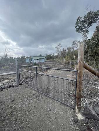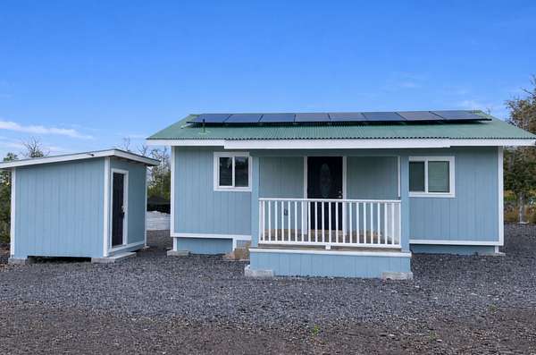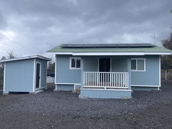 This 1-acre off-grid property in Hawaiian Ocean View Estates offers a move-in-ready start to Big Island living. Located in the lower section of the subdivision, the parcel enjoys easy access and is just minutes from Ocean View Town Center and Highway 11. The fully fenced and gated acre is graded with fairly level terrain, providing a usable, open space for gardening, parking, or future expansion while enjoying the surrounding forest setting. The property features a recently built off-grid home set up for comfortable self-sufficient living, complete with an 8-panel photovoltaic solar system with battery storage and a large 10,000-gallon catchment tank. Inside, the home offers a fresh, modern feel with luxury vinyl flooring throughout, marble countertops, recessed lighting, propane stove, and a kitchen outfitted with new appliances. Boundary pins are staked and visible for added clarity of the lot lines. The structure was built without permits, offering an opportunity for buyers seeking a ready-to-use off-grid setup in a convenient and desirable area of Hawaiian Ocean View Estates.