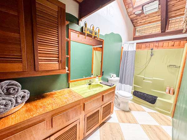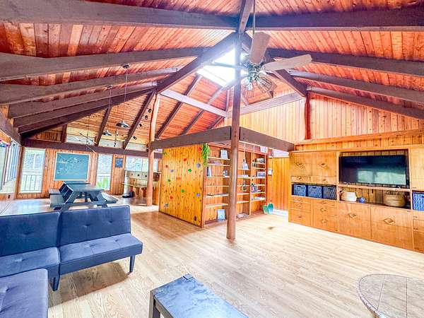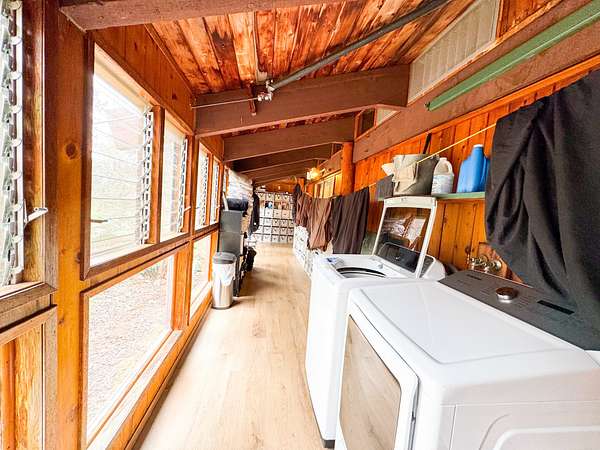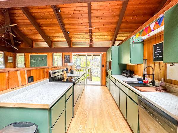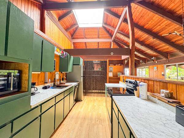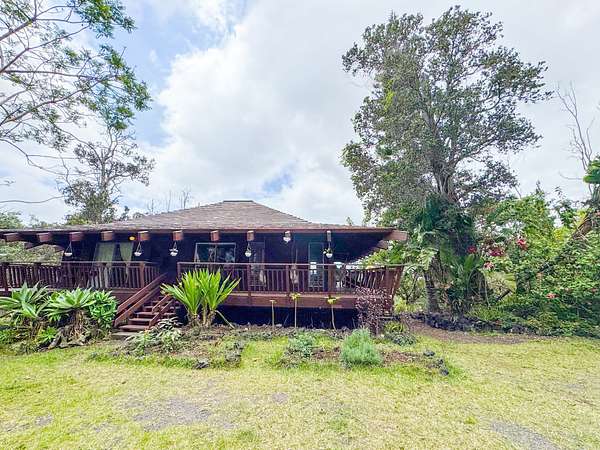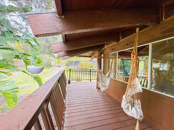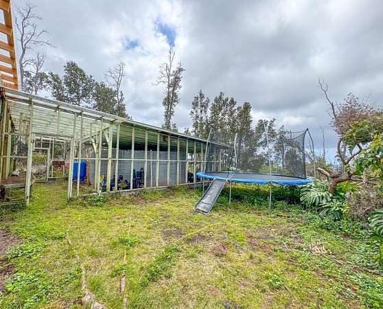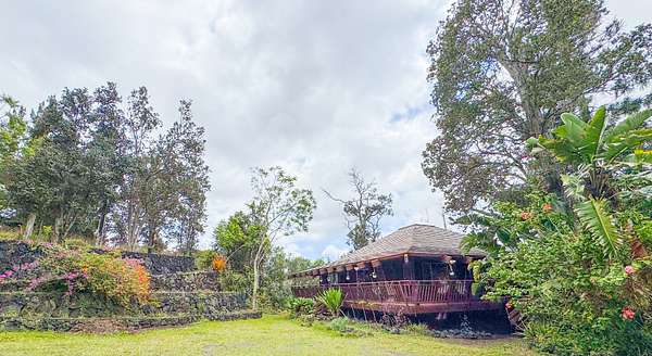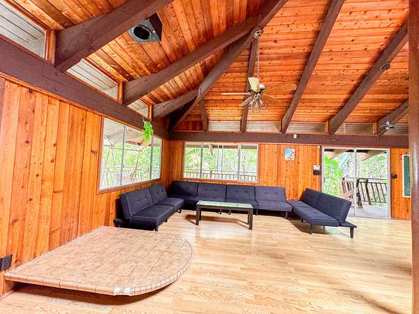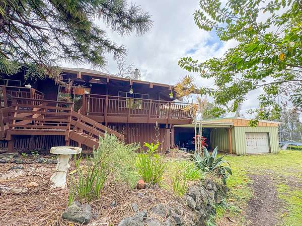 Welcome to your own private oasis nestled within the lush landscapes of Ocean View, where a circular driveway gracefully leads you to this enchanting Custom Cedar Home. Step inside to open beam ceilings and a magnificent skylight, bathing the expansive living space in natural light. Walls of windows frame panoramic views of the surrounding greenery. This 3-bedroom, 2-1/2-bath home (with added 3rd bedroom) spreads across 2 serene acres, offering tranquility and comfort. Enjoy two distinct living areas, including a former indoor hot tub room. The main living room provides ample storage and space for a free-standing fireplace. Entertain in the dining room that flows into a spacious kitchen with abundant storage and a large walk-in pantry. Step onto the wrap-around lanai, adding 1260 sf of outdoor living, including a large enclosed laundry area. Live wood accents and lush landscaping create a luxurious treehouse-like retreat. Outside, a covered catchment tank and nursery space await your green thumb, with majestic Ohia trees, Hawaiian flora, and charming rock walls enhancing the grounds. Additional highlights include an unfinished basement and an incredible over 400sf workshop with roll-down door, and an above ground pool, plus a large carport for vehicle shelter. Embrace Ocean View Community living, with local eateries, coffee shop, groceries, gas, hardware, and more just moments away. A short drive brings you to swimming at Ho'okena, Punalu'u, or Green Sands Beach. Experience the perfect blend of comfort, convenience, and natural Hawaiian beauty in this extraordinary haven.