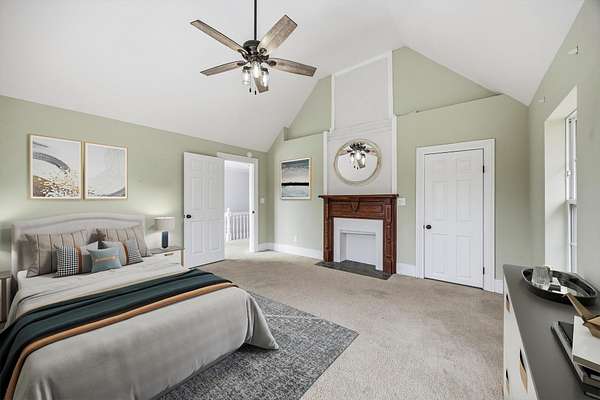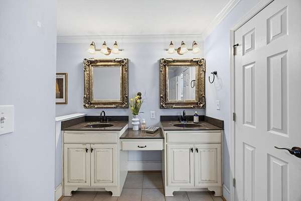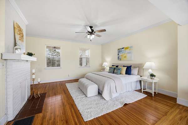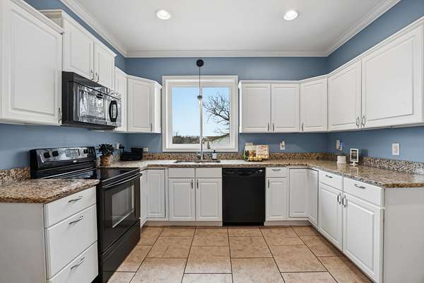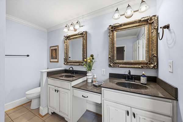 The main-level primary suite offers a peaceful retreat with a sitting area, double vanities, walk-in closet, and tile shower. Upstairs features 3 additional bedrooms, a double-vanity bath, and vinyl windows throughout.
