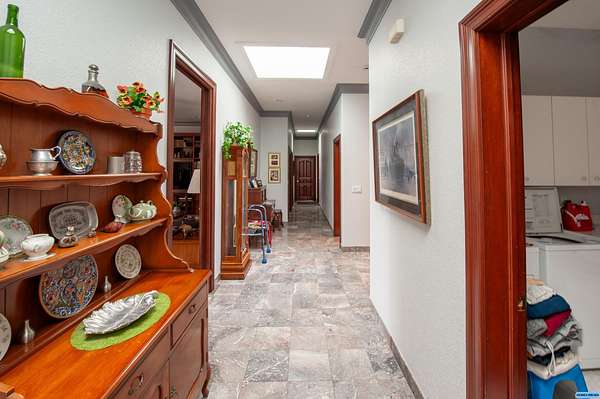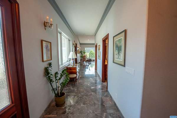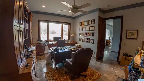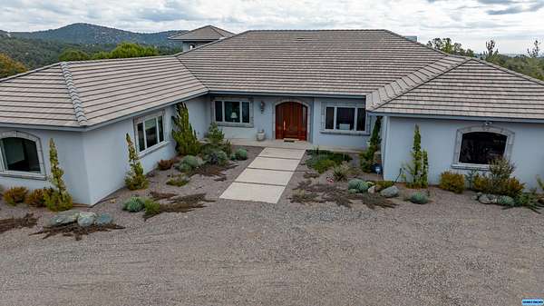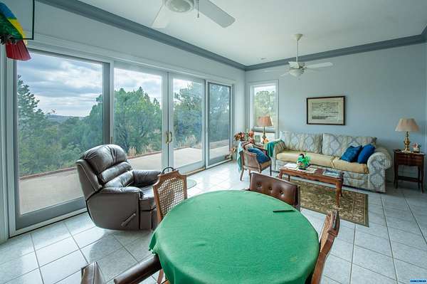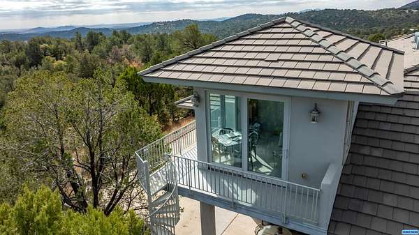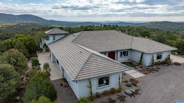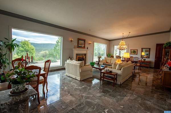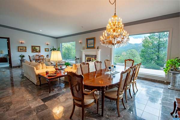 Exquisite from the custom made front doors to the views out of every window. Quality and perfection went into this home from start to finish. The partially lighted driveway from Enchanted Trail to the home is professionally maintained. Italian tile floors throughout with wall to wall carpet in the bedrooms. Oversize picture windows in the living room are 1/4 inch thick. Beautiful chandeliers in the entry, hallway and dining area are stunning. Custom made cabinets in the kitchen, den, office and throughout the home add to the charm and livability. Radiant in floor heating for cozy, comfortable winters. Enjoy the sunroom year round with a pass through from the kitchen for easy browsing. Built-in TV and speakers in the den will convey with the home. 3+ garage with more storage.