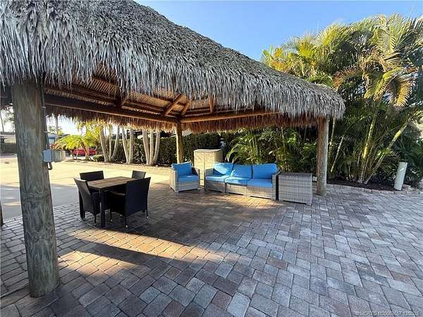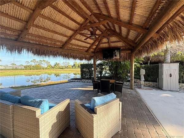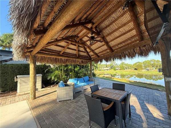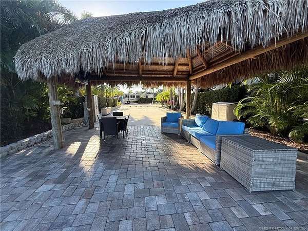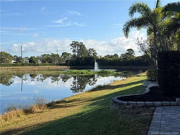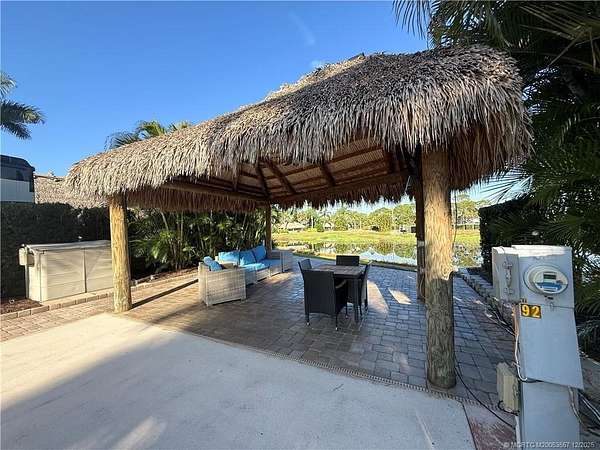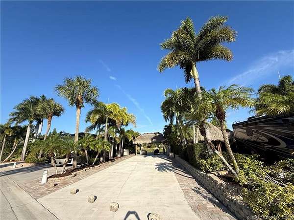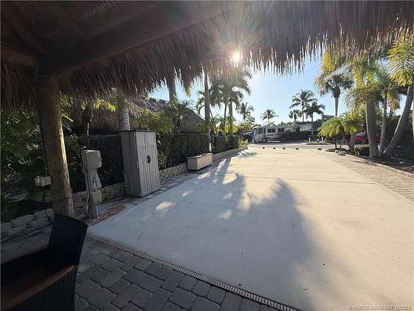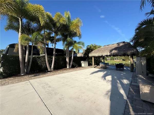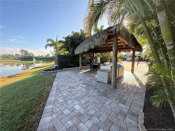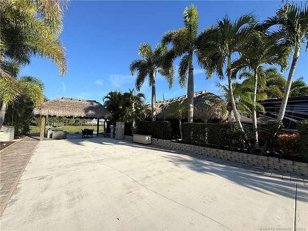 Exquisite lakefront lot backing onto the largest natural lake in the resort, offering breathtaking water views and a tranquil setting perfect for fishing and wildlife observation. Mature, professionally landscaped beds featuring elegant foxtail palms create exceptional privacy on both sides, while the rear of the property enjoys complete seclusion with unobstructed lake vistas. A generous tiki hut provides a shaded retreat for relaxing or entertaining, complemented by a spacious rear patio ideal for sunbathing or hosting guests. Impeccably maintained and move-in ready, this refined outdoor living space is a true bird lover's paradise, blending luxury, serenity, and natural beauty in a premier setting.