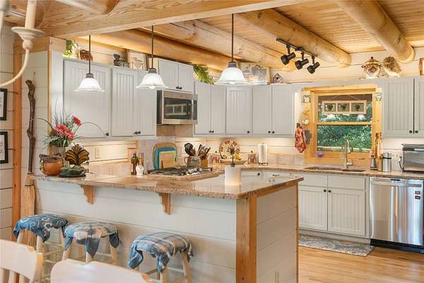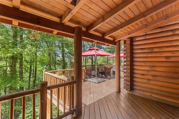 Discover the timeless appeal of mountain living in this classic log cabin on 2.28 private acres with beautiful mountain views in Burlingame Golf and Country Club. Designed for comfort and relaxation, the great room welcomes with a soaring stone fireplace, abundant natural light, and doors opening to a spacious open deck with beautiful views. A wraparound porch offers additional space to enjoy the fresh mountain air. The thoughtfully designed kitchen features updated appliances, including a double oven, and opens to a sunlit dining area with a large window and built-in window seat. Whether for hosting friends or enjoying a quiet morning coffee, the oversized deck serves as a front-row seat to the beauty of the surrounding landscape. The extra-large primary suite creates a private haven with its own fireplace, while the upper level comes with two generous guest rooms and a large loft for reading, playing games, or relaxing. The lower level boasts a cozy gathering area, a full bathroom, a bedroom or office, a craft room, and a shop for hobbies and projects. An additional 1.7-acre lot next door may be available for purchase separately. Please inquire with the listing broker. This inviting property offers a quintessential mountain retreat in one of the Plateau's most sought-after communities, combining a vibrant lifestyle with natural surroundings. Membership to Burlingame Country Club - by invitation but not required for ownership - provides access to world-class golf, tennis, fitness, and dining amenities along with a welcoming social calendar. Parks, hiking trails, fishing ponds, and trout waters create endless possibilities for outdoor adventures and provide a serene yet engaging environment to relax, explore, and make lasting memories.