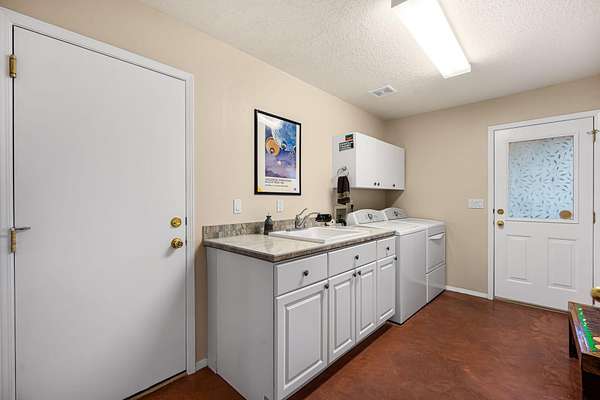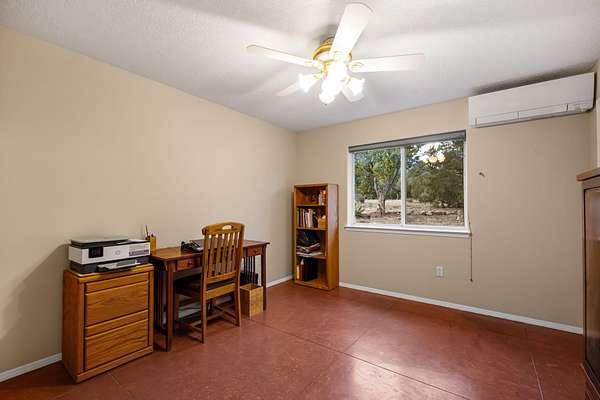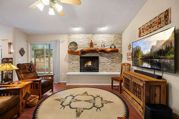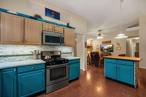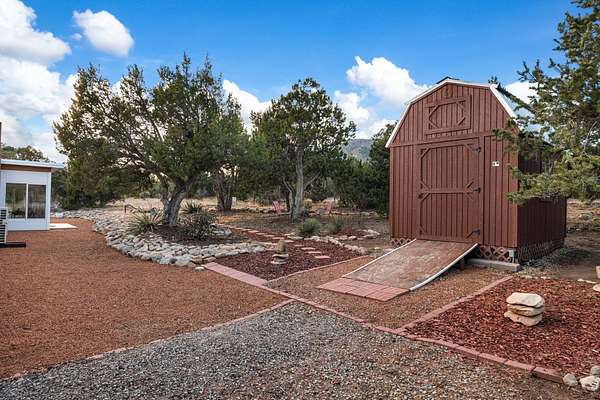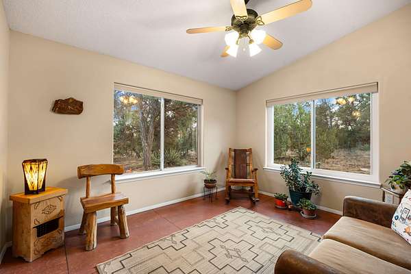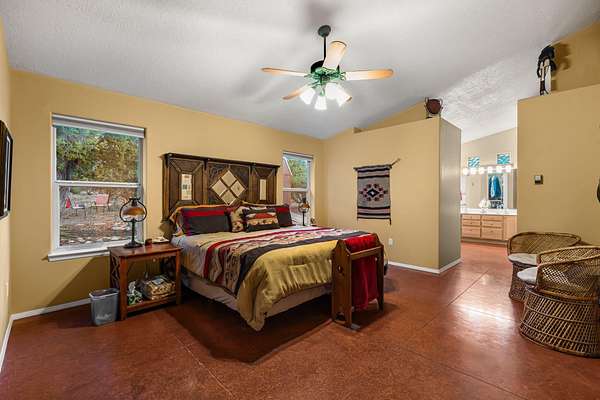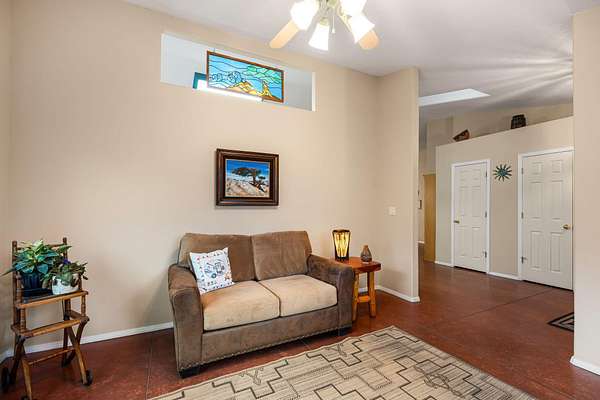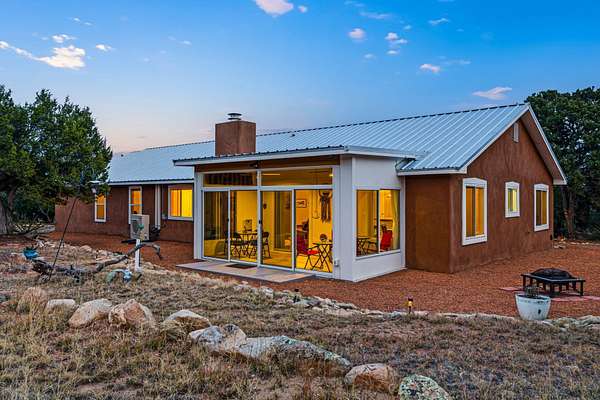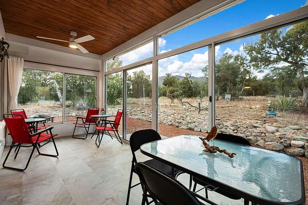 Nestled in the private, gated community of Tierra Encantada, this 4-acre property offers tranquil and refined living. The single-story home features 2157 sq ft with 3 bedrooms, 2 baths, two living areas and a sunroom. The family room includes a gas assisted wood burning fireplace with stone surround and a custom wood mantel with turquoise inlay. The remodeled kitchen has quartz countertops, a custom island with bar seating and a pantry cabinet. The owner's suite offers a sitting area, his-and-hers closets, dual sinks and a roll-in shower. Concrete floors, radiant heat, mini splits, city water, septic, owned solar and a 2-car plus RV garage add comfort and convenience. Enjoy San Pedro Mountain views in this tranquil, wildlife-rich setting. See MORE for all updates & improvements.