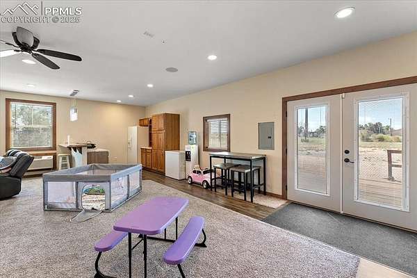 This well-cared-for home offers a thoughtful blend of comfort, space, and versatility. A spacious 900-square-foot addition provides room for gathering or relaxing, complete with an electric fireplace, wet bar, and plenty of options to make it your own. The kitchen is updated with stainless steel appliances, generous cabinet space, and a cozy coffee bar that makes mornings a little brighter. Each bedroom is comfortably sized with walk-in closets and easy-care laminate flooring. The primary suite features a full five-piece bath, while the second full bath is equally well designed. Outside, you'll find a large detached garage/shop with 220V power, RV shore power, mezzanine storage, and plumbing for a propane heater-ideal for hobbies or extra workspace. A back deck with a hot tub offers a private spot to unwind. The property sits on 2.37 acres with city utilities-water, sewer, gas, and electric-along with a new AC system for year-round comfort. The lot extends past a peaceful stream and is horse-friendly, giving you both space and flexibility.