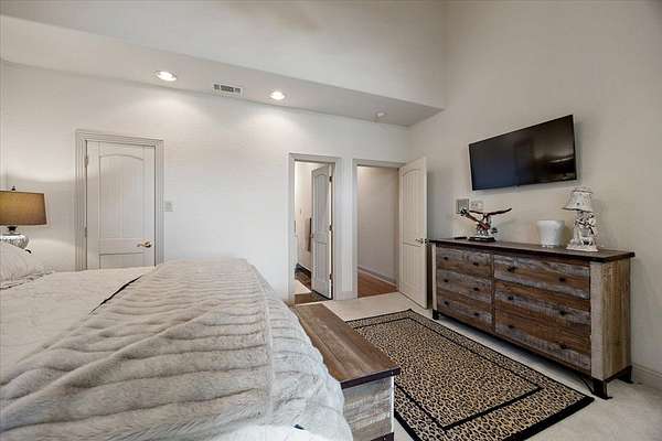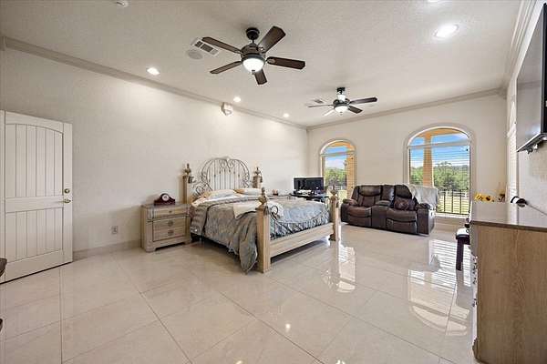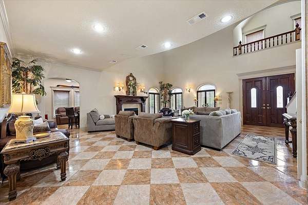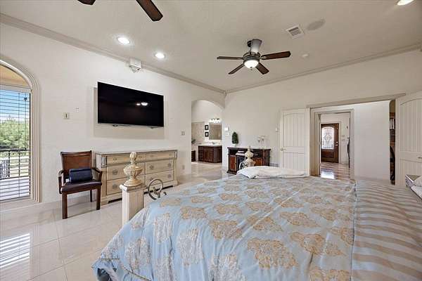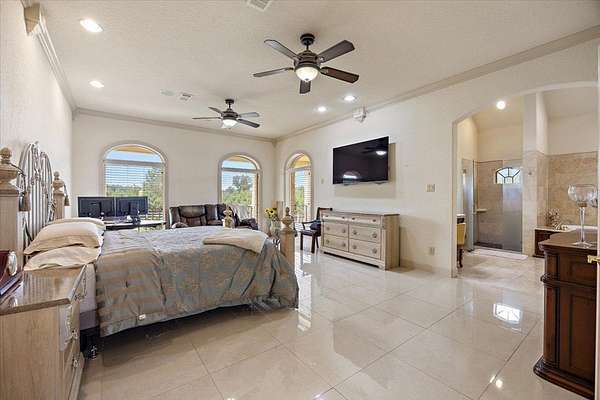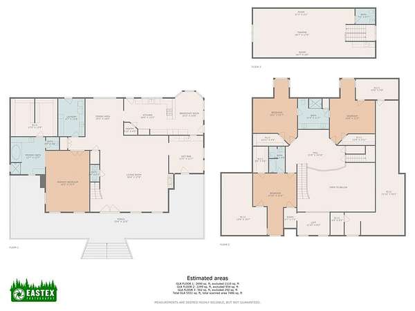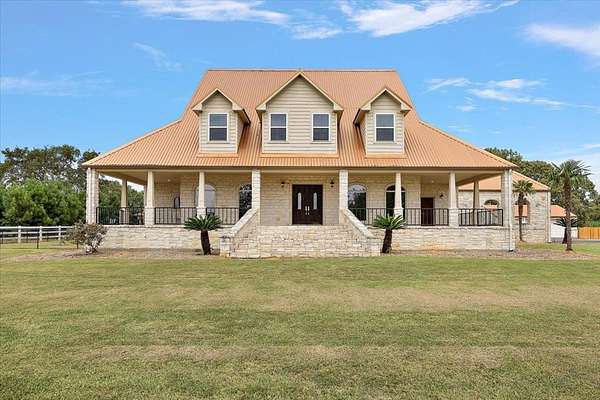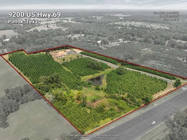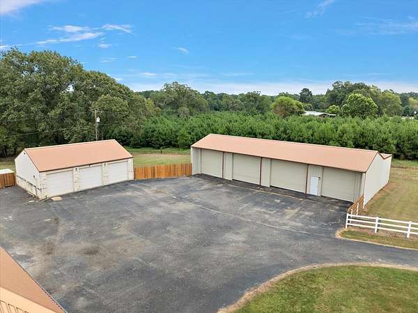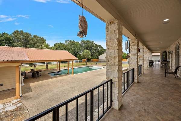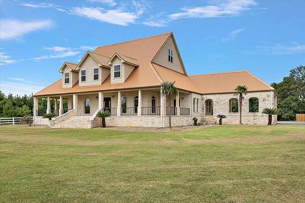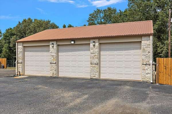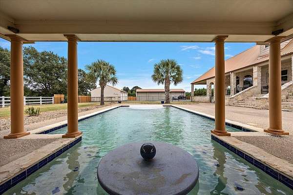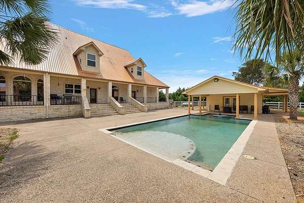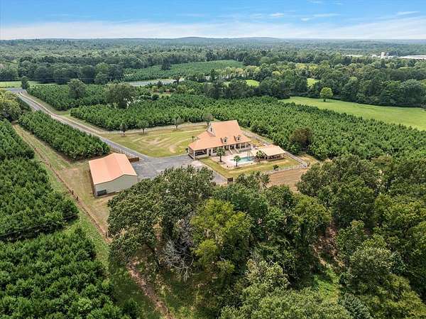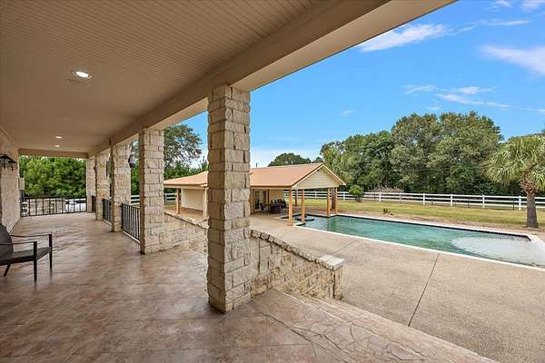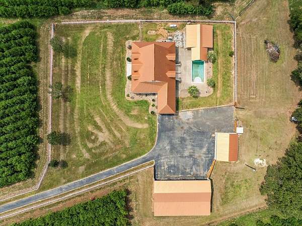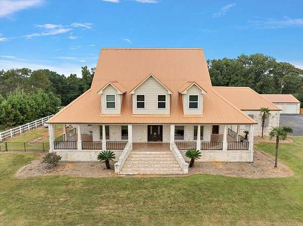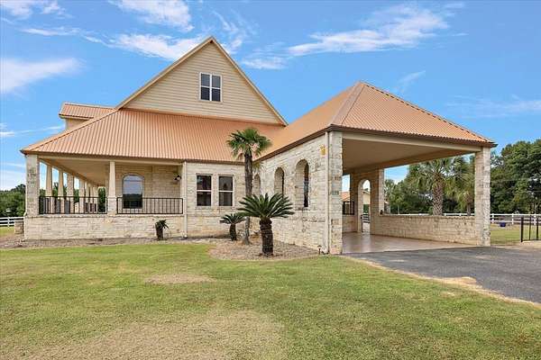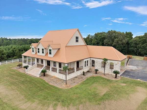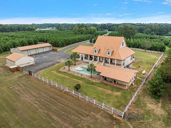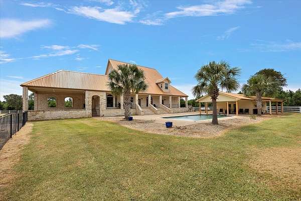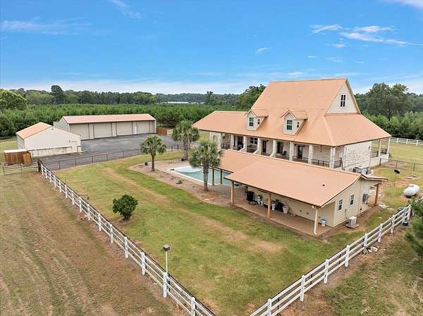 NEW LOWER PRICE This stunning three-story custom home is set on 19.5 wooded acres, offering a serene retreat among the pines. The home boasts impressive features, including custom cabinetry, stainless steel appliances, tile flooring, granite countertops, arched doorways and windows, soaring ceilings, and a spacious primary suite with a sitting area, luxurious bathroom, and large walk-in closet on the first floor. The 2nd floor features three generously sized bedrooms, two beautifully designed bathrooms with custom tile work, a cozy nook overlooking the first floor, and hidden storage spaces. The 3rd floor includes a fantastic media room and a half bath. Outside, enjoy a gorgeous pool with a built-in table, benches, and beach entry, along with a pool house ideal as a guest or in-law suite, complete with a bedroom and bathroom. External features include an Austin stone exterior, copper-colored metal roof, three-car garage, 4,000 sq ft metal building, and an electric entry gate