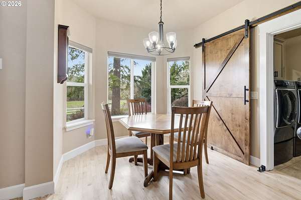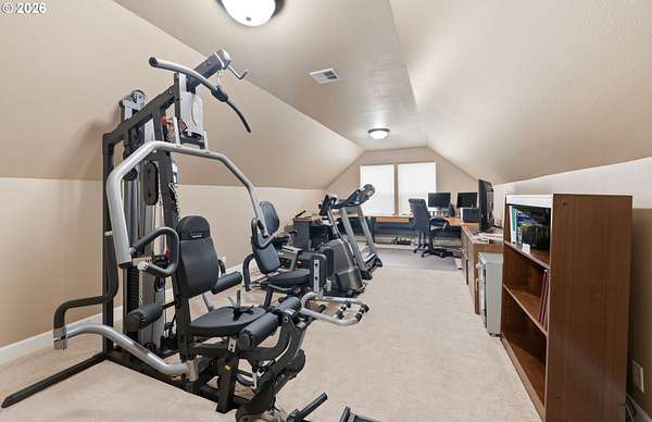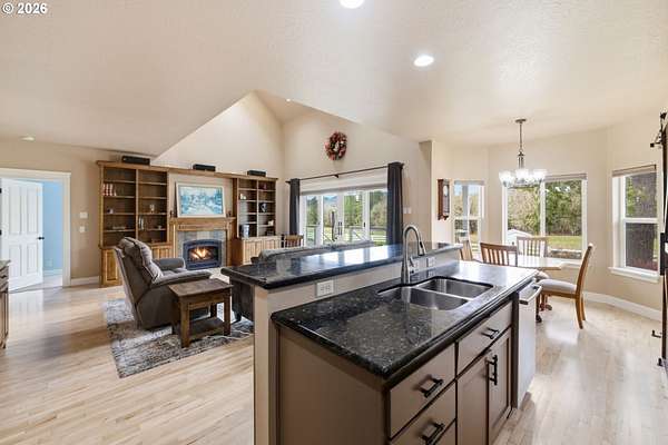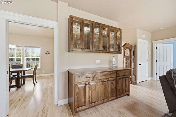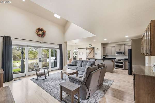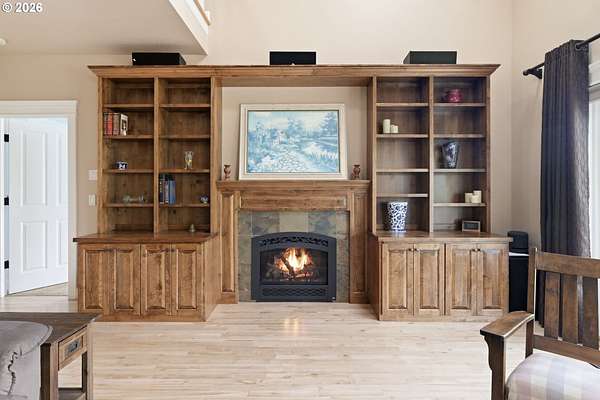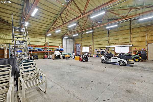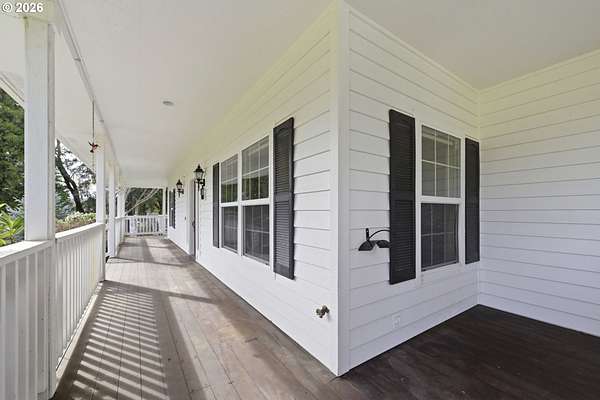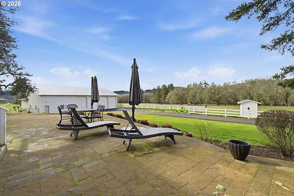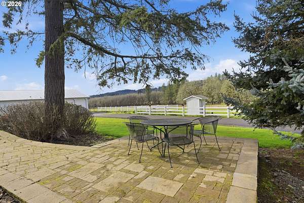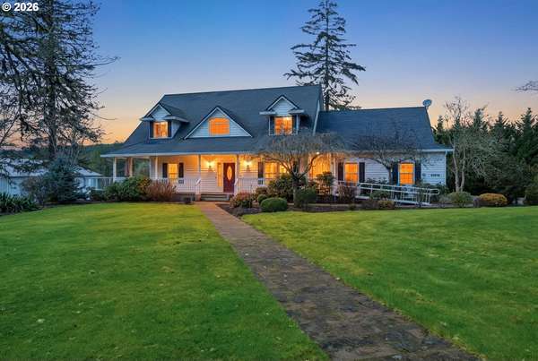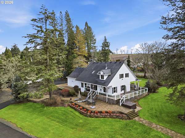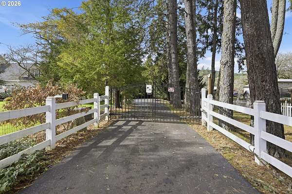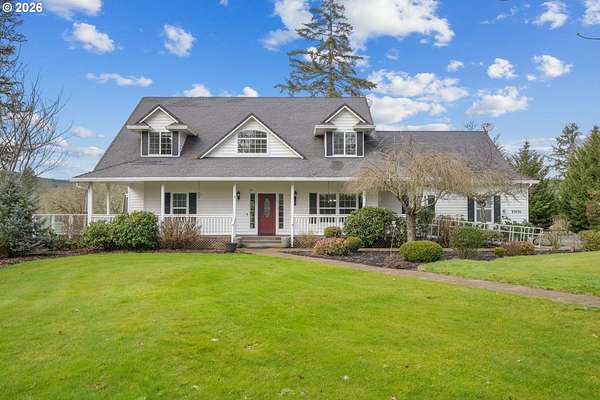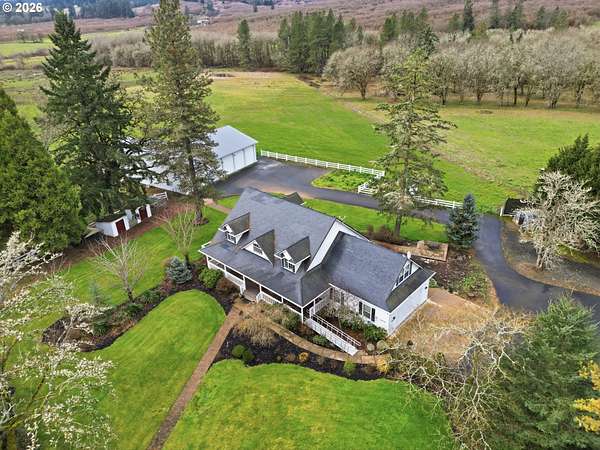 Custom built home on over 8 acres in a highly desirable location along the scenic Territorial Wine Corridor, offering privacy, usable land, and convenient access to town and Eugene. Set in a private park-like setting with gated driveway, classic dormer windows, and a welcoming covered wraparound front deck, this property combines timeless design with functional rural living. Inside, vaulted ceilings, skylights, and expansive windows create abundant natural light and beautiful views throughout. Features include hardwood flooring, extensive custom built-ins, propane fireplace, remote-controlled blinds, central vacuum system, formal dining, and a breakfast nook. The kitchen is thoughtfully designed with granite countertops, island with eat bar, stainless appliances, propane double-oven range, built-in microwave, beverage refrigerator, barn-door walk-in pantry, and generous storage.The main-level primary suite offers high ceilings, large windows, walk-in closet with built-ins, and spacious bath with dual vanity and walk-in shower. Upstairs includes three additional bedrooms-all with walk-in closets-including an ensuite, plus a large bonus room ideal for office, media, or flex space. Improvements include refinished custom flooring, upgraded exterior doors, improved well system, water softener, new water heater with expansion tank, and LeafGuard gutter system. Outdoor amenities include over an acre of fenced yard with hot tub, expansive deck, paver patio, sprinkler system, greenhouse, raised garden beds, grapes, dog kennel area, and mature landscaping. Over seven acres of fenced pasture are ready for livestock with hay barn and covered cattle/horse area. The impressive 72x50 shop features concrete floors, ductless heat pump, high ceilings, four roll-up doors, and a fifth bay for equipment, plus ample RV and boat parking.A rare opportunity to enjoy acreage, infrastructure, and lifestyle in wine country.