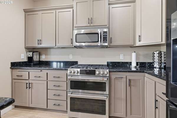 - Builtin Oven, Dishwasher, Double Oven, Free Standing Refrigerator, Gas Appliances, Granite, Island, Microwave, Pantry, Plumbed For Ice Maker, Stainless Steel Appliance, Wine Cooler