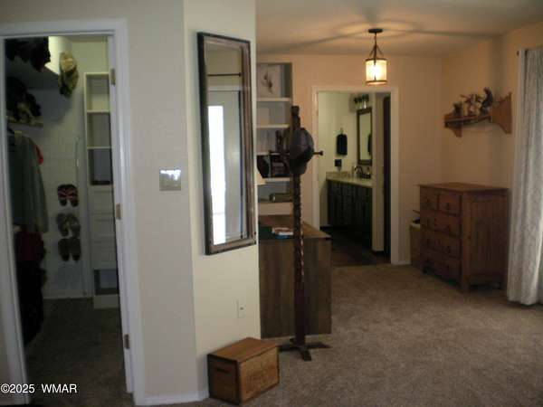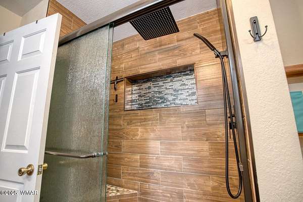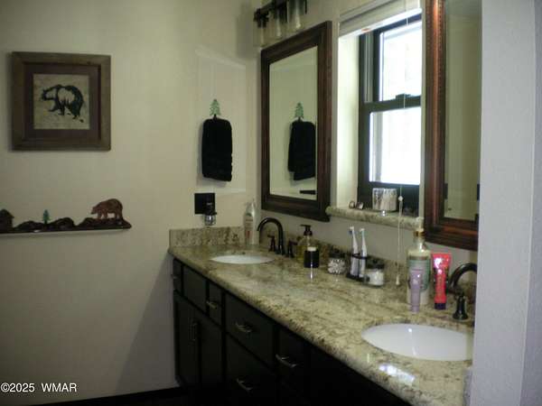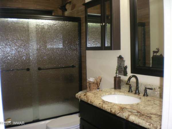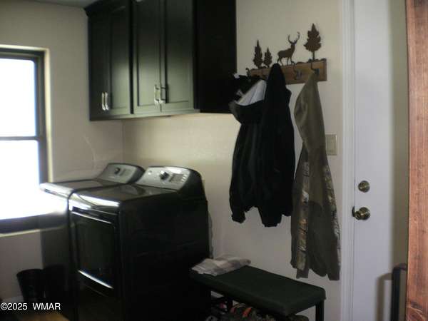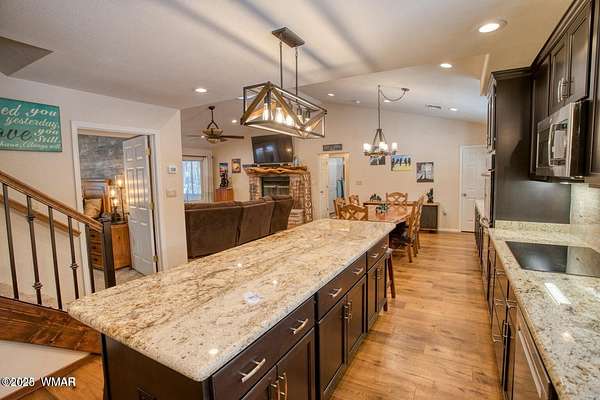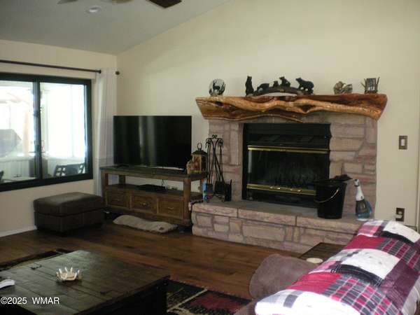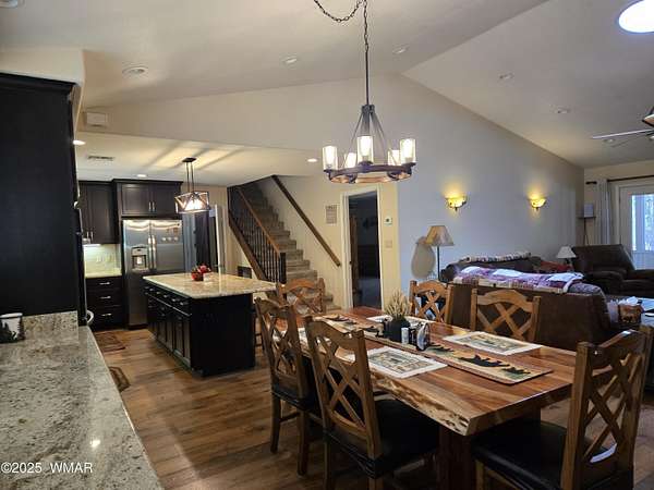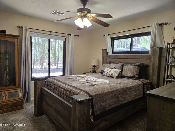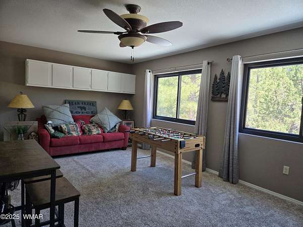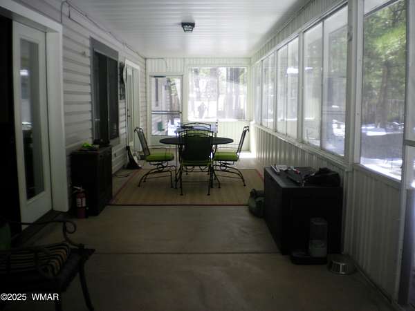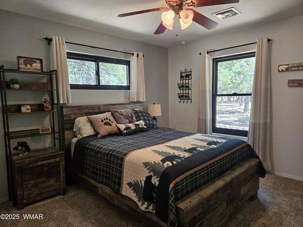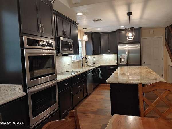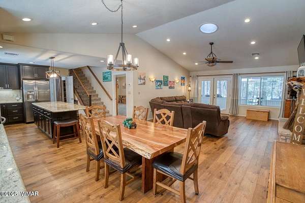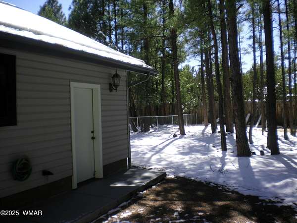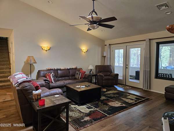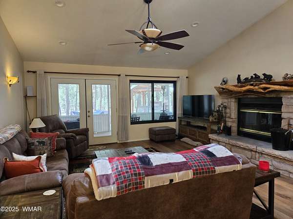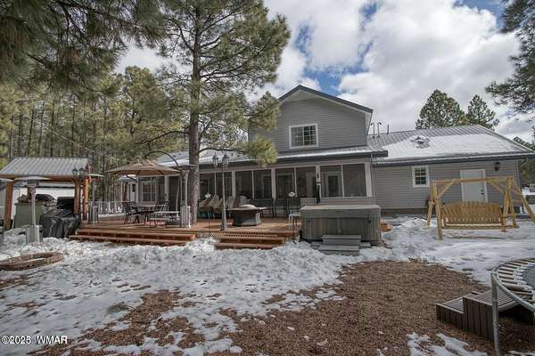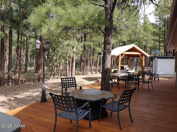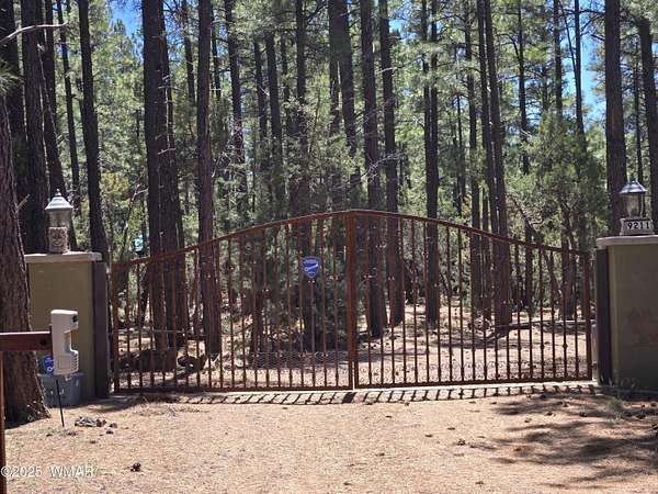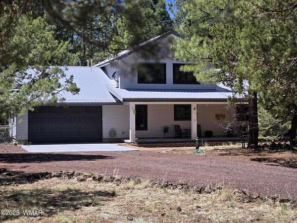 Discover the soul of this beautifully remodeled 2-acre estate nestled against the serene national forest. Enter through a stately electronic gate into a private haven with two fenced acres, a separate pet enclosure, and direct forest access. A nearby seasonal creek fills the air with the soothing sound of rushing water during monsoon season. Zoned for horses and livestock, this property is a dream for nature lovers. Wildlife is abundant-elk, deer, turkeys, rabbits, and eagles are regular visitors. The irrigated flowerbed along the covered front porch attracts hummingbirds, woodpeckers, jays, squirrels, and chipmunks. Relax on the porch rocker and soak in the peaceful surroundings. Perfect for entertaining, the home offers ample parking, a screened-in patio with removable glass, a spacious redwood deck, and a large backyard with a built-in BBQ, firepit, and hot tub. The front yard features six raised garden beds with irrigation, a garden or wood shop with electricity, and water/power plumbed throughout. The property is perked for an additional 3bd/2.5ba septic system and has an approved Special Use Permit for a guest houseplans included. Inside, the open floor plan welcomes you with vaulted ceilings and a rock-surround wood-burning fireplace with a custom juniper mantle. The 2021 renovation includes espresso Karman cabinets with soft-close doors, a 9' island and buffet, granite countertops, stainless steel appliances, under-cabinet and pendant lighting, oil-rubbed bronze fixtures, and engineered hardwood flooring throughout (plush carpet in bedrooms and stairs). Additional features include a laundry room with built-in cabinets and space for a second refrigerator, an oversized pantry with barn door, and a custom wrought-iron and wood stair railing. The downstairs master suite offers a sitting room, built-in library shelves, accent wall, walk-in closet, and double doors to the screened patio. The master bath boasts a large tiled shower with dual heads, rain-glass sliding doors, heat lamp, double sinks, and matching cabinets and granite. Two more bedrooms and a full bath are downstairs, with two oversized bedrooms and a half bath upstairsideal for multi-generational living. Upgrades include a metal roof with enclosed eaves, rain gutters, skylight, snow stop (2020), insulated Clopay garage door and opener (2022), two-car garage with 9x9 workshop/storage, and new black Andersen windows (2023). With AC, propane heat, and water from a private company, comfort is assured. Starlink RV internet and DISH TV or streaming available. Located at 7,000 ft elevation on a County Island with no HOA. Deer Run is county-maintained; Holly is privately maintained.
