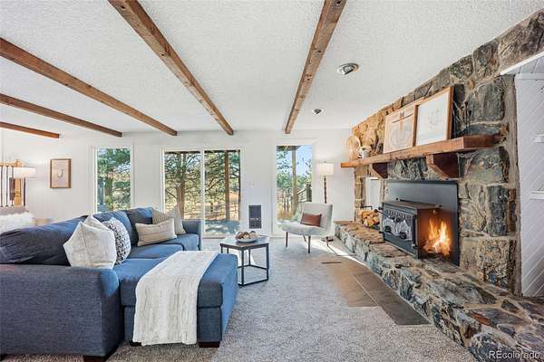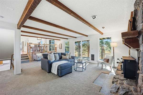 Vaulted ceilings with exposed beams create a warm, inviting feel. The updated kitchen offers white cabinetry, granite countertops, and stainless steel appliances, opening to a welcoming living area with a striking stone fireplace. Energy-efficient skylights and double-pane windows fill the home with natural light. Recent upgrades include a new roof, fresh interior and exterior paint, new carpet, and updated electrical. An expansive 1,000+ sq ft wraparound deck is ideal for entertaining or relaxing with views. Upstairs, the primary suite features a private treetop deck, plus three additional bedrooms and two full baths. The finished walkout basement adds flexible space with a large family room, wet bar, game room, and office or workshop. Five-piece baths, walk-in closets, and granite and tile finishes complete the interior. The gently rolling acreage offers ideal sites for a barn or arena, providing excellent horse property potential with room for turnout and riding. Additional features include a covered deck, front porch, smart irrigation, partial fencing, chicken coop, oversized heated two-car garage with 220V EV charging, and well and septic systems. Newly installed smart garage door with upgraded motor. Located in the Douglas County RE-1 School District, 10–15 minutes to Parker shopping and dining, with a low HOA of approximately $25 per year and no metro district taxes. Vacant and easy to show, this is a rare opportunity for private acreage living close to town.
