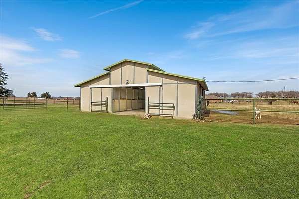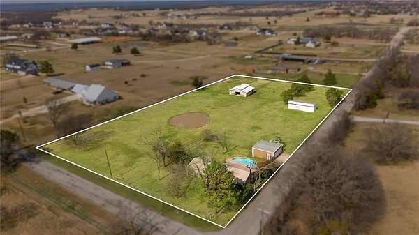Experience the perfect blend of country living and modern comfort on this stunning 3-acre ranchette in Pilot Point, Texas. Ideally positioned on a picturesque corner lot, this fully fenced equestrian property with pond offers peaceful privacy while maintaining convenient access to Denton, Frisco, Prosper, Celina, and the North Dallas corridor, making it an ideal retreat with easy commuting options. Designed for horse enthusiasts and hobby ranchers, the property features multiple pipe-fenced turnouts, a seasonal tank pond, multiple fenced pastures, plus secondary separate climate controlled office or game room. The impressive 36x36 barn includes five stalls, a concrete alleyway, tack room, and a sliding wall system that converts two stalls into a spacious 12x20 configuration, offering flexibility for larger horses or multi-use space. Step outside to your private backyard oasis complete with lush landscaping, two covered patios perfect for outdoor entertaining, and a sparkling in-ground swimming pool ideal for enjoying warm Texas evenings. A detached oversized two-car garage provides ample room for trucks, equipment, or workshop space. Inside, the quaint 3-bedroom, 2-bath home showcases rustic charm with wood-beamed vaulted ceilings, a fireplace, and an open-concept living area designed for comfortable everyday living. A staircase leads to a functional storage loft, adding versatility to the space. The kitchen features updated Kitchen Aide appliances, a gas cooktop, expansive pantry wall, and dining area perfect for gatherings. The spacious primary suite offers a relaxing sitting area, walk-in closet, and updated ensuite bath. With endless opportunities to modernize and personalize, this property presents exceptional value for buyers seeking acreage, equestrian amenities, and a serene North Texas lifestyle. If you're searching for horse property in Pilot Point, acreage near Denton or Frisco, or a Texas ranchette with barn and pool, this one checks all the boxes.