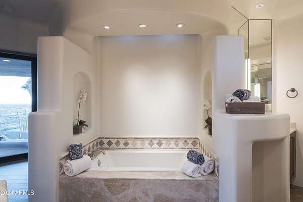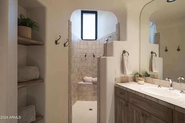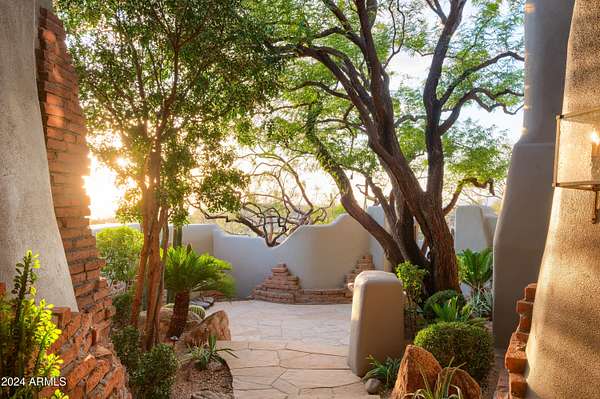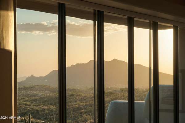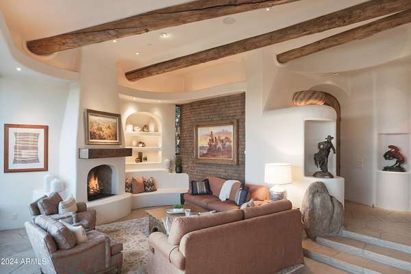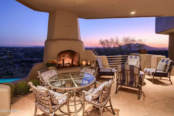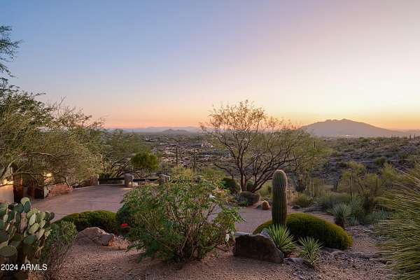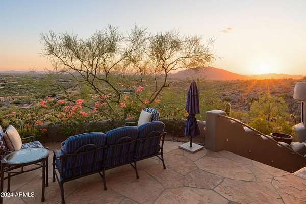 Enjoy 260 Degree VIEWS from this charming Lash McDaniels design home is nestled within the community of Carefree Ranch yet within close proximity of the gate. You are welcomed with a mix of warm earthy tones, a weathered brick accents and inviting wood courtyard gates. As you enter the home, you're greeted by a spacious foyer adorned with vintage decor and soft lighting. The living room boasts large windows flooding the space with natural light all while highlighting the warm wood details and cozy fireplace. Entertain family and friends in the intimate elevated formal dining room. The kitchen combines modern appliances with rustic cabinetry, creating yet another warm and inviting space which flows seamlessly into the breakfast area and family room with fireplace. A cozy office with custom wood doors is just steps away from primary suite which features another inviting fireplace, sitting area and stunning views. On the opposite wing you will find two comfortable bedrooms, each with its own unique character and ample storage space. The private separate guest castia is sure to please all your guest with kitchenette and forever views. Outdoors patio spaces are a serene oasis with private pool and spa, multiple sitting and entertaining areas, large fireplace and built in BBQ; relax and enjoy the amazing Arizona sunsets, mountains and stunning city iight views.