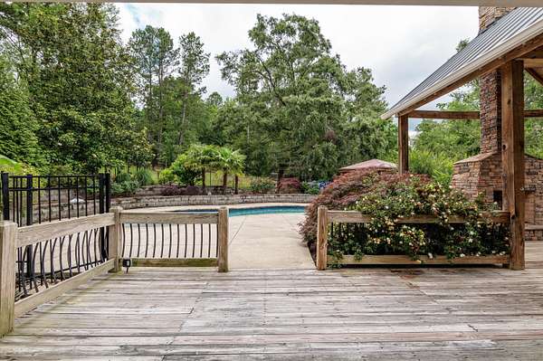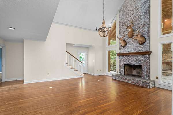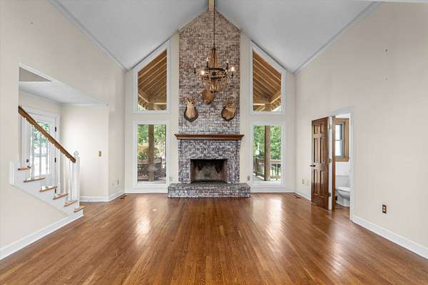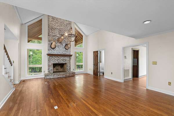 Welcome to your dream home! Nestled on a serene 1.5-acre lot offering exceptional privacy, this beautifully maintained 4-bedroom, 2.5-bathroom home combines classic charm with thoughtful updates and modern comfort. Step inside to find hardwood floors throughout the main level, leading you into a spacious living room with vaulted ceilings, a gorgeous brick fireplace, and large, tinted windows that flood the space with natural light. The formal dining room and breakfast area also boast oversized windows, creating a bright and inviting atmosphere throughout. The heart of the home is the kitchen, featuring timeless wooden cabinetry and easy access to both dining spaces - perfect for hosting gatherings. The primary bathroom and upstairs Jack and Jill bath have been stylishly updated, offering a fresh, modern touch to this well-appointed home. Downstairs, a finished basement adds even more living space, complete with a second brick fireplace and a dedicated AC and heating wall unit for year-round comfort. Outdoor living is just as impressive: enjoy summer days in your private pool with a Baja shelf, or unwind on the covered back porch, which includes a cozy outdoor fireplace. A pond with a private dock adds to the property's charm and peaceful appeal. Additional features include a wrap-around front porch, a workshop in the garage, and crawl space and attic storage. With the backyard backing up to a power line easement, you'll enjoy extra privacy and the quiet tranquility of nature. Don't miss this rare opportunity to own a property that offers both comfort and outdoor lifestyle in one perfect package!