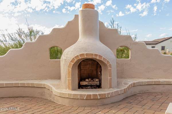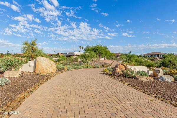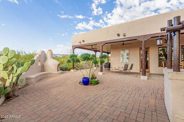 Beautiful home nestled on a peaceful & gorgeous cul-de-sac lot with amazing mountain views complete serenity & privacy a must see. This stunning Santa Fe-style retreat home that showcases timeless charm & gorgeous desert elegance! The home welcomes you with natural desert landscaping, an extra-long brick paved driveway, & a 3-car garage with built-in cabinetry for added storage. A serene courtyard entry boasting a shade tree & a lemon tree sets the tone for the tranquil atmosphere inside! Explore the bright open layout adorned with flagstone floors, beamed ceilings, & plantation shutters throughout. The Great room invites relaxation with its cozy beehive fireplace & media niche, while the formal dining area provides a perfect space for gatherings. Bring your buyers they will LOVE IT!! Ample eat-in kitchen is a chef's delight, showcasing a large center island for prep & breakfast bar, wood cabinets with crown molding, granite counters, SS appliances, stone backsplash, & recessed lightingplus direct access to the backyard. Luminous main bedroom offers a private escape with backyard access, a mirrored door walk-in closet, & a lavish ensuite featuring dual vanities, a makeup vanity, a jetted tub, & a glass block shower wall. The laundry room includes a utility sink for convenience! Out back, experience resort-style living with multiple seating areas, a gated blue pool, lush green grass, & breathtaking mountain/desert views. The full-length covered patio, outdoor fireplace, built-in BBQ, & raised terrace make this space ideal for entertaining under Arizona's gorgeous sunsets. Southwestern charm with modern comforts! A true desert sanctuary!