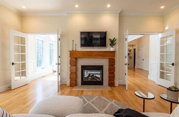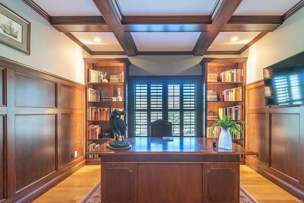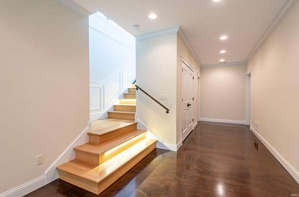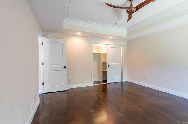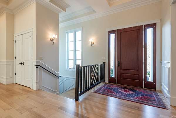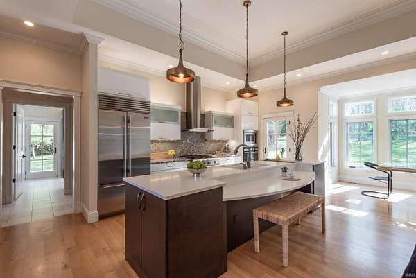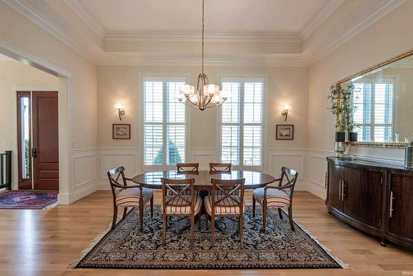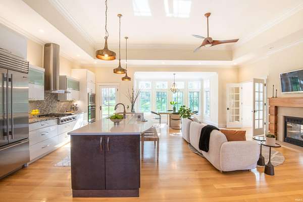 This exceptional luxury residence blends timeless elegance and modern sophistication. Nestled on a serene, more than 2.5-acre parcel, this custom-built brick estate is bordered by 39 acres of county-owned wooded land, ensuring unparalleled privacy and a natural backdrop of tranquility. The interior displays masterful craftsmanship and premium finishes throughout. The main living spaces feature site-finished white oak flooring, soaring ceilings, and intricate crown molding, all bathed in natural light from oversized windows that frame views of the lush surroundings. Multiple fireplaces offer warmth and ambiance in both formal and informal living areas, perfect for entertaining or quiet evenings at home. The richly appointed, wood-paneled study features built-in bookshelves and a classic hearth, perfect for working or unwinding in style. The spacious laundry room is thoughtfully designed with custom cabinetry and an integrated office space ideal for remote work or organization--framed by peaceful wooded views that make even everyday tasks feel elevated. The heart of the home is a chef's dream kitchen outfitted with high-efficiency, state-of-the-art appliances, custom cabinetry, and refined finishes. Seamless indoor-outdoor flow invites you to enjoy peaceful mornings or sunset gatherings on the expansive patio, embraced by mature trees and natural beauty. First floor living is complimented by an almost two thousand square foot walk out basement with nine-foot ceilings, an extra bedroom, full bathroom, wet bar, media/ entertainment area, and copious storage options. This home offers spacious bedrooms, spa-inspired bathrooms, and versatile living spaces, all designed with comfort and luxury in mind. Every detail reflects superior quality and thoughtful design. Located a short drive from Indiana University, Eagle Point Golf Resort, outdoor recreation, and Lake Monroe. This rare offering in Foggy Morning Glen combines the best of refined living and natural beauty.