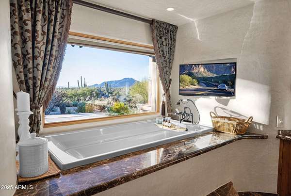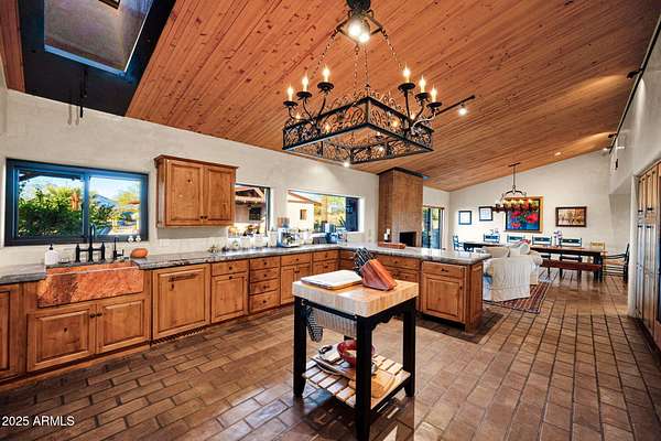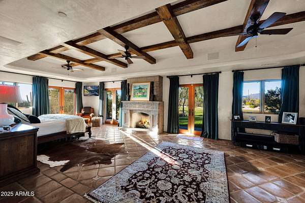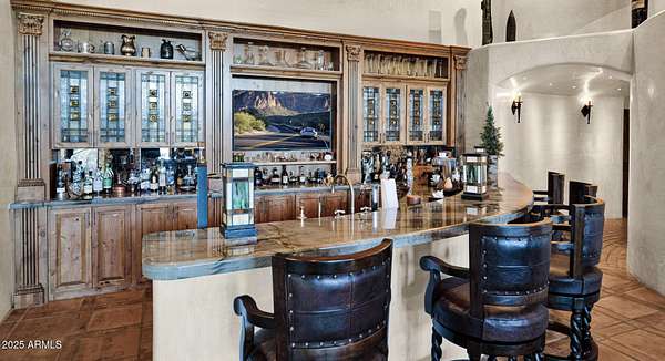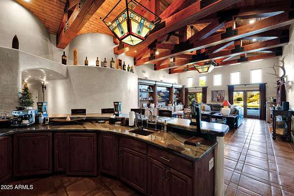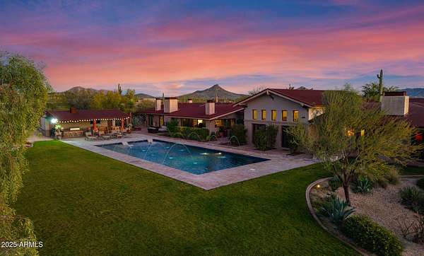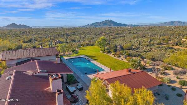 Lives like a private executive compound- ideal for those who prioritize privacy, views, security, and exceptional space for cars, hobbies and Arizona living. With 20 direct wired cameras with remote monitoring capabilities, a discretely fully fenced back yard, a large back up generator connected to a 500 gallon buried propane tank and an advanced security system, this single story residence offers full confidence. The refined architectural elements, highest quality build, and garage capacity for up to 15 vehicles, present a rare offering at this scale. The home's horseshoe layout centers around an intimate courtyard, creating a natural flow between the two main living areas while maintaining privacy. Architectural details such as Venetian plaster, hand-carved wood beams, clay tile accents and a striking metal roofline add warmth and character throughout. Both primary living spaces are oriented toward the pool and expansive mountain backdrop, offering a consistent connection to the outdoors. One wing includes the chef's kitchen, dining area, and family room designed for everyday living, while the opposite wing opens into a dramatic entertaining space with soaring ceilings and a full bar. The courtyard, pool, and mountain views anchor the property and are visible from all key gathering areas. The primary suite features a cozy fireplace, a distinctive round boutique-style closet, and a spa-like bath with a soaking tub and walk-in shower positioned to capture the scenery. Just outside, a private outdoor Jacuzzi offers another place to unwind. Two additional guest suites include en-suite baths and walk-in closets, and a dedicated office provides an ideal workspace. Outdoor living is a standout feature, with a rare stretch of lush grass surrounding one of the largest privately owned pools in Scottsdale, complemented by a covered patio with misters for year-round comfort and a full garden that adds another usable outdoor space. Mature desert landscaping and multiple patios expand the homes livability even further. For car enthusiasts or anyone needing flexible space, the 3 garages offer exceptional versatility, including a temperature-controlled RV garage and workshop, and space for lifts, displays, or specialty storage. The attached garage has a 50 amp electric car charger and the RV garage has another 50 amp circuit with full RV hookup. These areas can also function as a gym, studio, batting cage, or hobby space. Private, secure, and architecturally distinctive, this estate captures the best of desert living with space, views, and functionality rarely found in North Scottsdale.