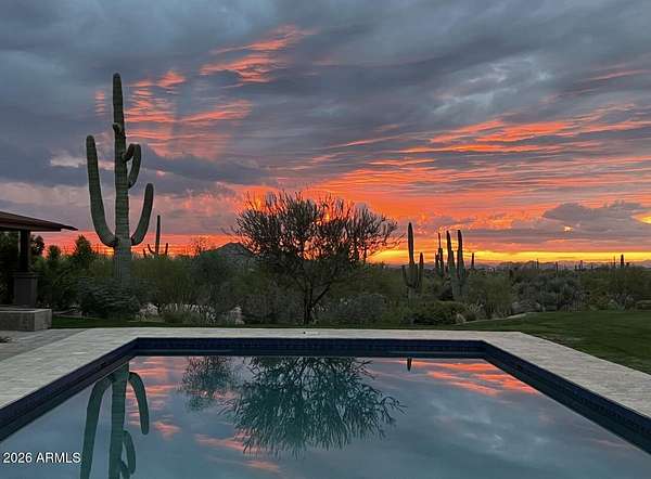 Over $200,000 in upgrades on nearly 3 acres surrounded by protected state land so your view remains yours. The expansiveness gives you the freedom to build a guest house, pickleball or tennis court or whatever you imagine for your private executive compound. Ideal for those who prioritize privacy, views, security & exceptional space for cars, hobbies and Arizona living. With 20 direct wired cameras with remote monitoring capabilities, a discretely fully fenced back yard, a large back up generator connected to a 500 gallon buried propane tank and an advanced security system, this single story residence offers full confidence. The refined architectural elements, highest quality build, and garage capacity for up to 15 vehicles, present a rare offering at this scale. The horseshoe layout centers around an intimate courtyard, creating a natural flow between the two main living areas while maintaining privacy. Architectural details such as Venetian plaster, hand-carved wood beams, clay tile accents and a striking metal roofline add warmth and character throughout. Both primary living spaces are oriented toward the pool and expansive mountain backdrop, offering a consistent connection to the outdoors. One wing includes the chef's kitchen, dining area, and family room designed for everyday living, while the opposite wing opens into a dramatic entertaining space with soaring ceilings and a full bar. The courtyard, pool, and mountain views anchor the property and are visible from all key gathering areas. The primary suite features a cozy fireplace, a distinctive round boutique-style closet, and a spa-like bath with a soaking tub and walk-in shower positioned to capture the scenery. Just outside, a private outdoor Jacuzzi offers another place to unwind. Two additional guest suites include en-suite baths and walk-in closets, and a dedicated office provides an ideal workspace. Outdoor living is a standout feature, with a rare stretch of lush grass surrounding one of the largest privately owned pools in Scottsdale, complemented by a covered patio with misters for year-round comfort and a full garden that adds another usable outdoor space. Mature desert landscaping and multiple patios expand the homes livability even further. For car enthusiasts or anyone needing flexible space, the 3 garages offer exceptional versatility, including a temperature-controlled RV garage and workshop, and space for lifts, displays, or specialty storage. The attached garage has a 50 amp electric car charger and the RV garage has another 50 amp circuit with full RV hookup. These areas can also function as a gym, studio, batting cage, or hobby space. Private, secure, and architecturally distinctive, this estate captures the best of desert living with space, views, and functionality rarely found in North Scottsdale.
