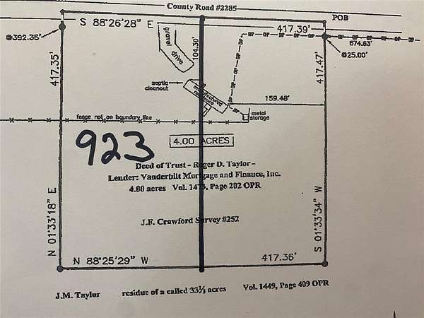 In Bonham go east on Hwy 82 to FM 897 and turn right, then go to FM 1396 and turn right, go to CR 2029 then turn left on CR 2285 go .7 mile and property is on the left. Sign on property.