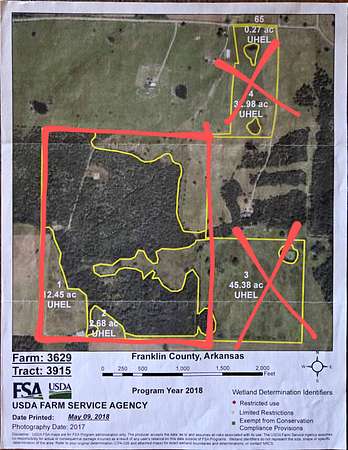 This nearly 180-acre property offers a perfect mix of pasture, woods, and water features, making it ideal for farming, hunting, or building your dream home. Or all of the above! Located in the County Line School District with school choice, it is fenced and cross-fenced except for road frontage. The land features five ponds, multiple wet-weather streams, and a diverse landscape of open pasture and mature trees, perfect for livestock or recreation. Two cleared pads are ready for a home, garage, shop, or barn. Whitetail deer, turkey, and other wildlife are abundant. Electric and gas are available at the road, and septic will be needed. An old well is located on the lower portion of the property, while a new well will be needed up top. Conveniently located just 20 minutes from Charleston or Ozark and 45 minutes from Fort Smith. A rare opportunity for a private retreat with endless potential.
