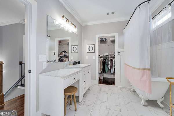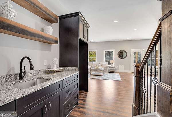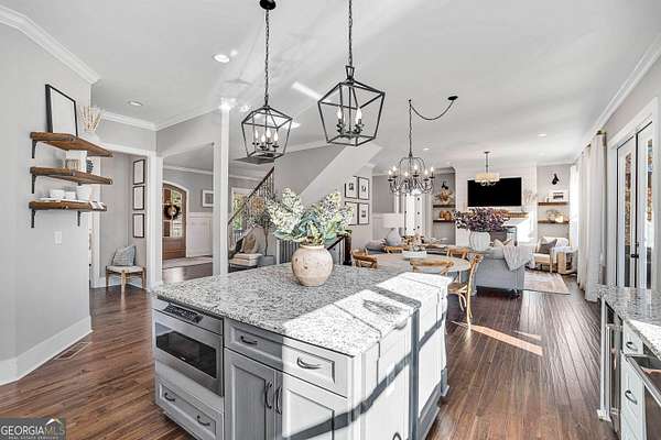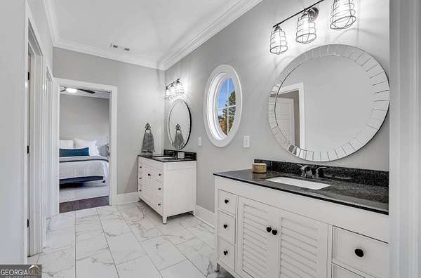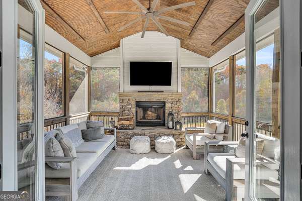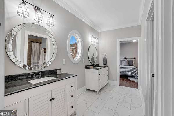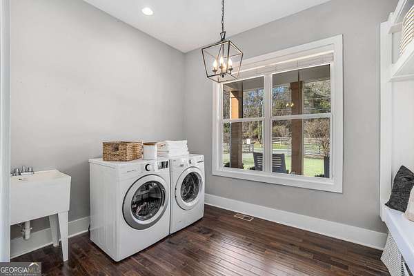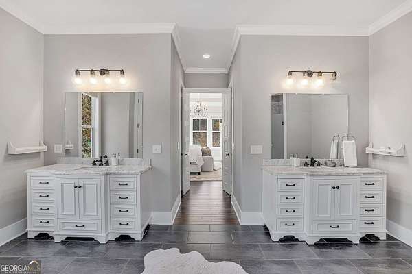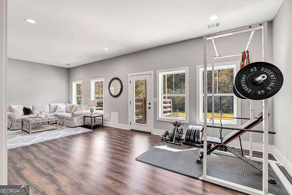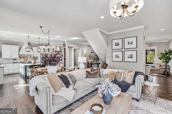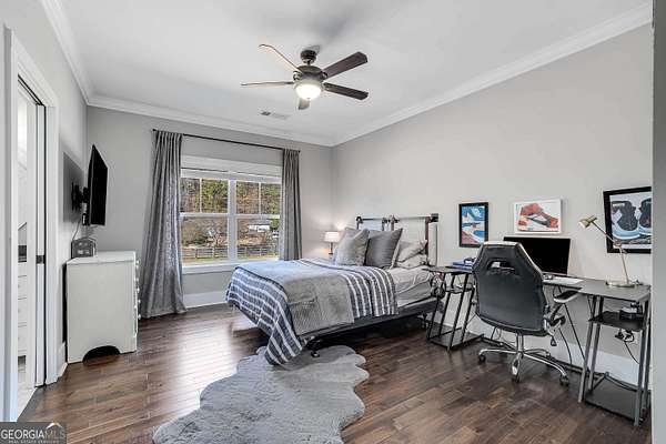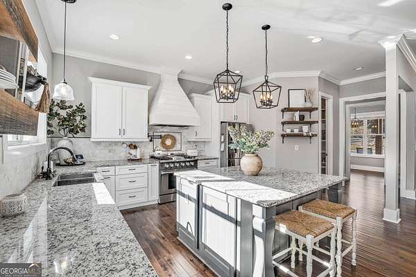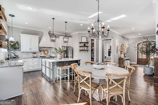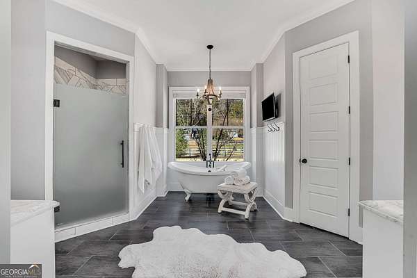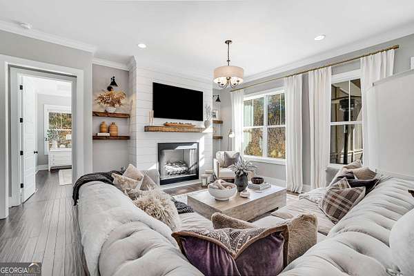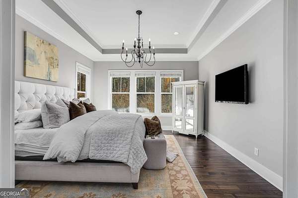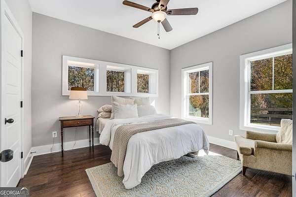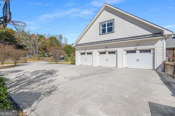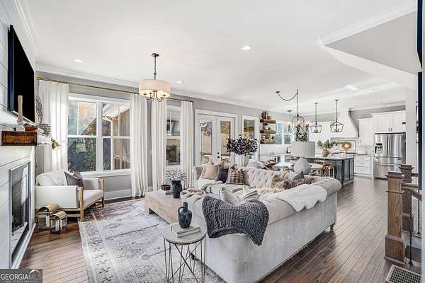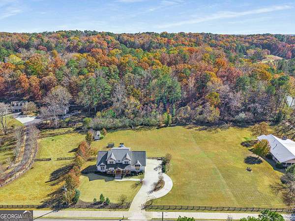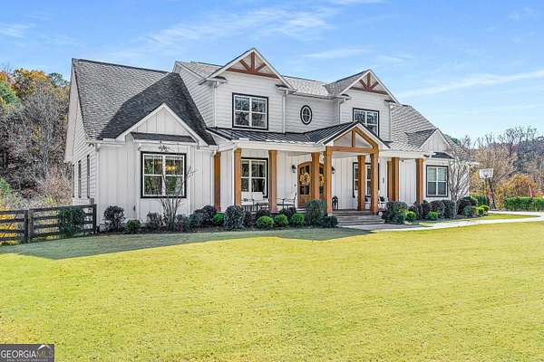 Wow! Experience refined Southern living in this exceptional Craftsman farmhouse on three lush acres in Johns Creek, offering the peaceful feel of the countryside right in the middle of North Atlanta! This beautiful 2018 custom-built 5 bed, 4.5 bath, primary-on-main, 3-car garage home features an inviting traditional farmhouse front porch, gleaming hardwoods throughout, high ceilings, and more! The main living level includes a formal dining room, cozy fireside family room, fabulous vaulted, covered screened porch with stone fireplace, and the updated heart-of-the-home, eat-in kitchen complete with island, stainless appliances, beverage cooler, walk-in pantry and adjacent breakfast area, all overlooking the private pastoral landscape of the backyard! The main level also includes the spacious primary suite with trey ceiling detail, dual closets, and large updated ensuite bath with separate vanities, walk-in shower, and clawfoot soaking tub! Upstairs, you'll find 3 sizable guest bedrooms, bonus room, one ensuite bath, and a Jack & Jill bath. The full finished daylight walk-out terrace level includes an additional family room/multi-purpose space, media room, kitchenette, guest bedroom, full guest bathroom, and lots of unfinished storage space! Outside, in addition to the covered screened porch, you'll find a deck on the main level - perfect for grilling, a lower level patio, acres of flat, tree-lined backyard ready for you to enjoy, and a convenient storage shed! Located within walking distance to Newtown Park and just minutes from Georgia 400, premier shopping, award-winning schools, and top-rated restaurants, this property delivers the ultimate Johns Creek lifestyle!