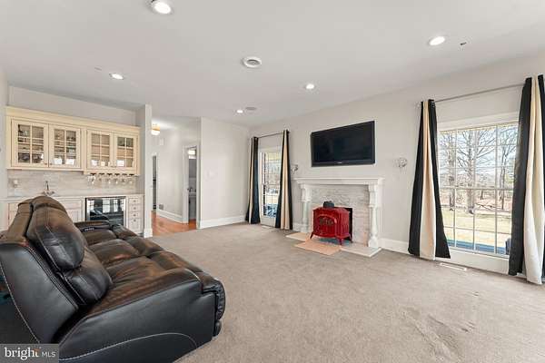 - Bar, Breakfast Area, Carpet, Ceiling Fan(s), Crown Moldings, Dining Area, Eat-In Kitchen, Family Room Off Kitchen, Island Kitchen, Pellet Stove, Primary Bath(s), Recessed Lighting, Soaking Tub Bathroom, Sound System, Stall Shower Bathroom, Table Space Kitchen, Upgraded Countertops, Wainscotting, Walk-In Closet(s), Walk-In Shower Bathroom, Wet/Dry Bar, Wood Floors, Wood Stove