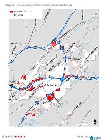 Two buildable parcels in Roebuck Plaza: 926 and 932 Navarro Ln Parcel IDs: 24-00-05-1-004-003.000 and 24-00-05-1-004-004.000. Approx sizes: 926 is 0.47 acres, 932 is 0.15 acres. Flat, easy-to-build lots on a quiet residential street with established single family homes. Quick access to I 20 and I 459 for Birmingham, Trussville, shopping, and services. Tree lined setting with room for a generous yard or side entry garage, depending on plan. City services and utilities are in the area. Photos include pages from the 2021 Blueprint Irondale Comprehensive Plan. That plan indicates Roebuck Plaza's future land use as potential commercial and mixed use redevelopment, timing unknown and subject to change.