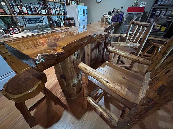 Full finished walk-out basement with 9' walls, featuring a full bar for entertaining, elecric pellet stove for extra warmth on cold winter nights, and drive-around access that could serve as additional living quarters or rental space