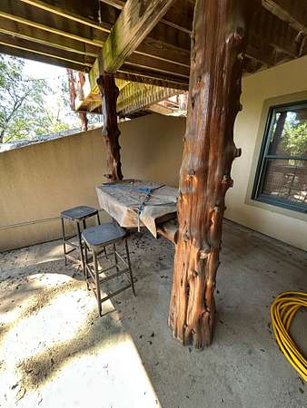 Attached carport on the west side with concrete floor and custom cedar posts ideal for covered parking or shaded oudoor relaxation!