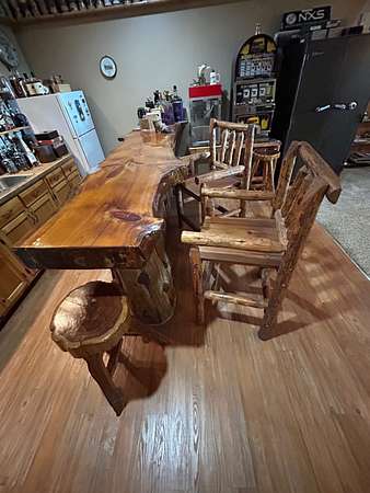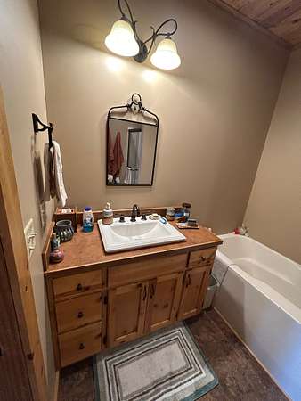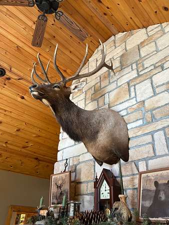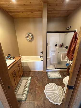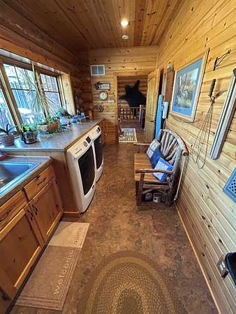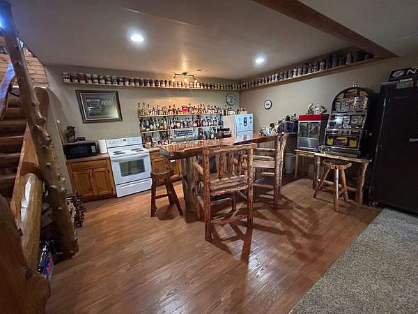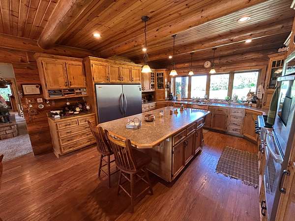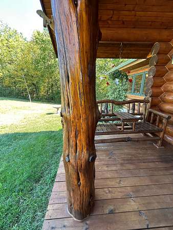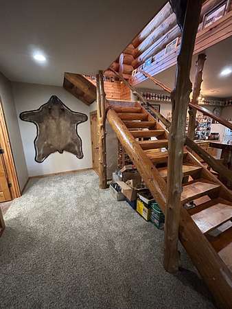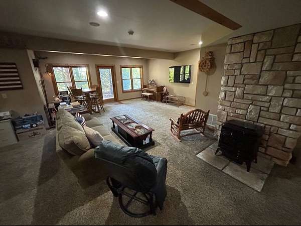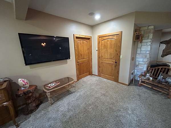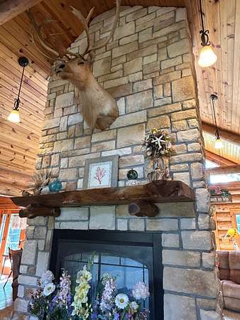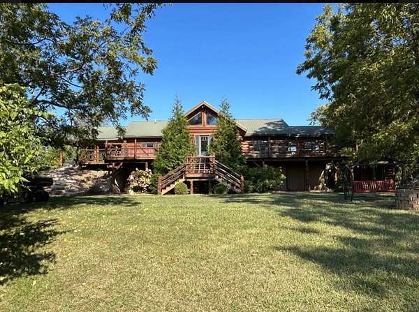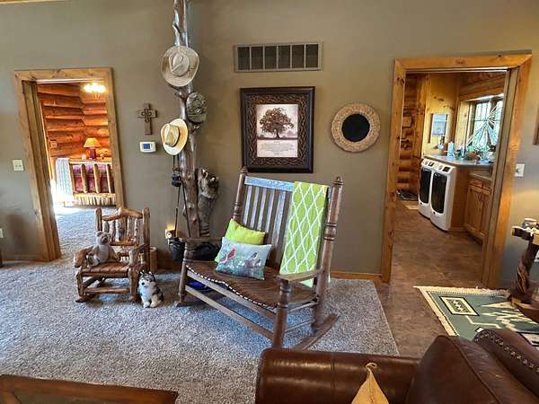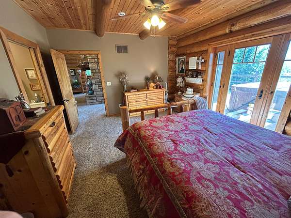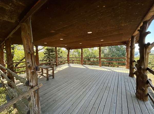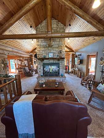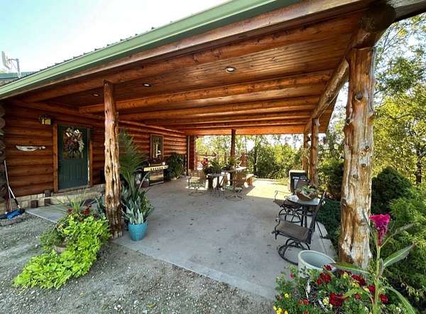 The fully finished walk-out basement features 9' walls, a full bar, an electric pellet stove, and drive-around access-perfect for entertaining, guest quarters, or potential rental space. Two additional bedrooms and a full bath in the basement offer privacy and versatility. An attached west-side carport with concrete flooring and custom cedar posts provides covered parking or shaded outdoor relaxation. The craftsmanship and setting give the home the feel of a private lodge tucked deep in the Ozarks, while remaining conveniently close to town and major highways.