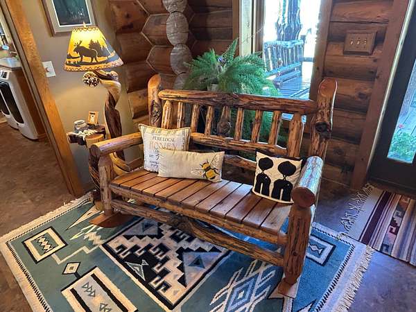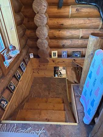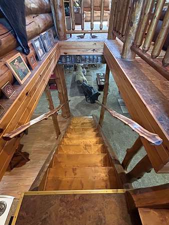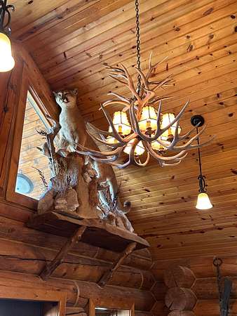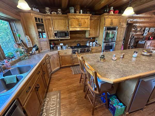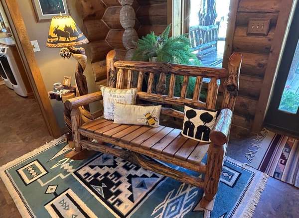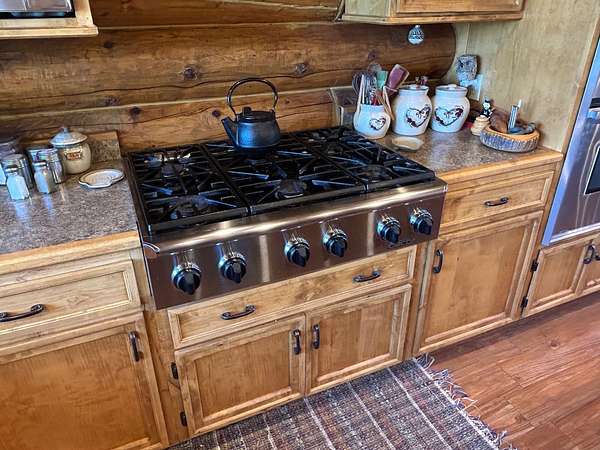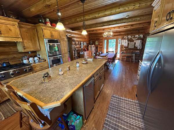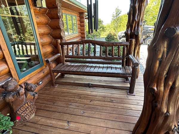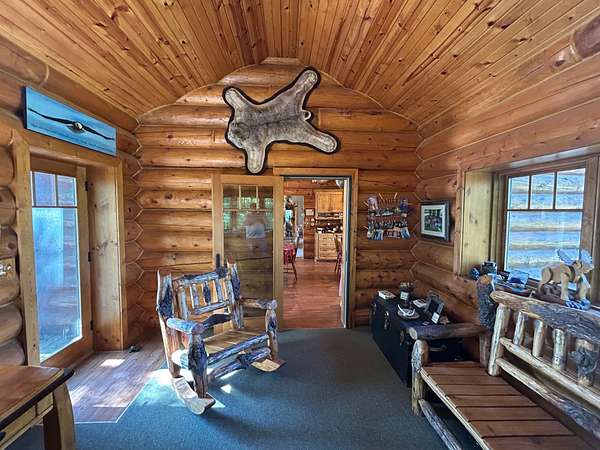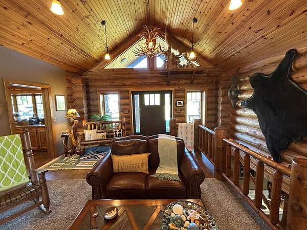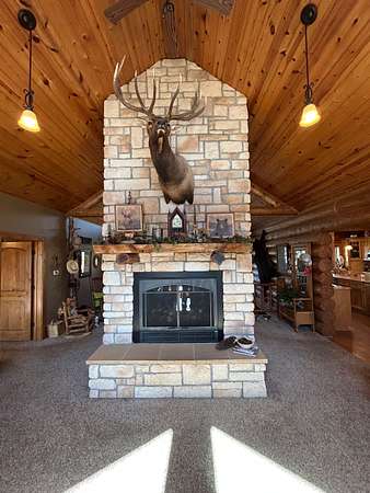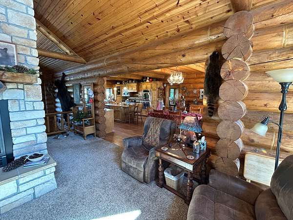 The custom Englemann Spruce log home, built in 2009, offers 3,960 sq. ft. of handcrafted quality and warmth. The expansive great room features a stunning see-through fireplace with floor-to-ceiling custom mantels, creating a striking centerpiece. The main-level primary suite includes direct access to the back deck and a jacuzzi hot tub overlooking the Missouri River. A custom kitchen with a large island and premium finishes, along with a sun-filled cozy sunroom, provides abundant natural light and seamless access to the deck.