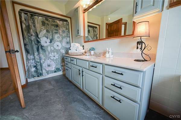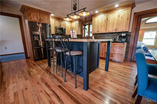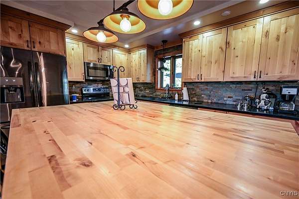 This captivating raised ranch style home, with its 2-car attached, oversized, garage, is pristine, modern and a must see! The curb appeal of this home could not be more inviting with its mature trees, spacious 2.50 acre lot, welcoming front porches, floral window boxes and perfectly landscaped vignette of hostas and perennials . Extra wide, paved drive accommodates a number of vehicles and other various equipment to fully take advantage of an outdoor way of life to include a camper which has a professionally installed RV electrical outlet panel to allow for multiple style plug ins. A 'supersized ' 38 x 40 garage! Wiring for EV charging as well! Opening the front door, you'll be struck by the home's open floor plan, light filled rooms, and neutral, on trend color palette. The well thought out floor plan opens up the kitchen, dining and living areas. Experiencing a recent 're fresh', many of the walls have a fresh coat of paint, and much of the flooring has been replaced and upgraded to include luxury vinyl flooring and new carpeting. One of the most striking features, is the renovated kitchen! Boasting knotty alder cabinetry, solid surface counters and stainless appliances. Stylish lighting, stone backsplash and double sized island with durable butcher block top complete this incredible space. The full bathroom on this level has just been reimagined and it shows! Spacious, with storage! The sleeping quarters at the opposite end of the main level were designed to be comfortable and spacious with ample closets and great window views to create exceptionally inviting spaces. The primary bedroom is an excellent example of thoughtful attention to livability in this serene retreat. Main level laundry room is a great convenience! A 3 season Adirondack room with sliders on each side which lead to deck spaces that draw one to enjoy the outdoor vistas in the rear of the home. Numerous decks, porches, and intimate seating, and heated pool, this property embraces an outdoor lifestyle. The abundant 'flex space' on the lower level of the home, to include a full bath, utility room, a play room and additional storage. Isn't it time you loved coming home every day!
