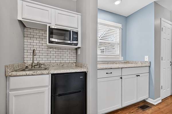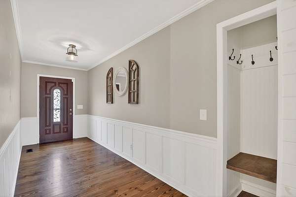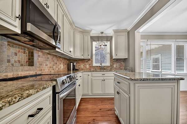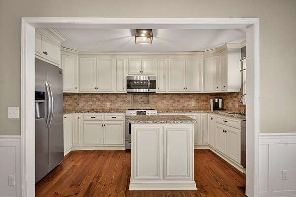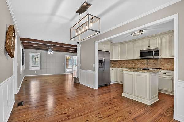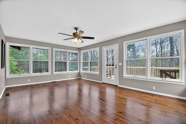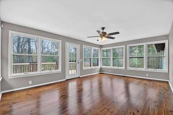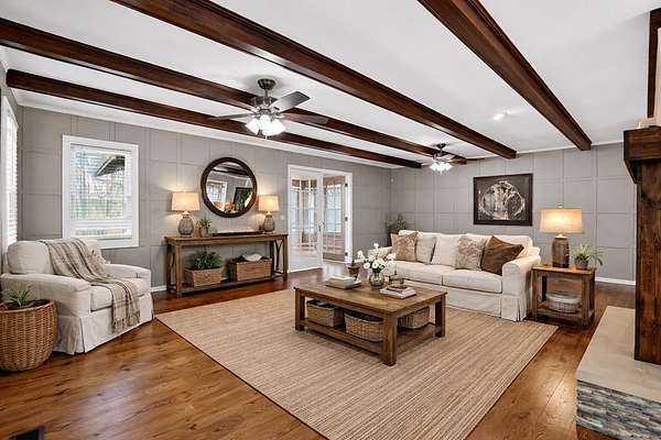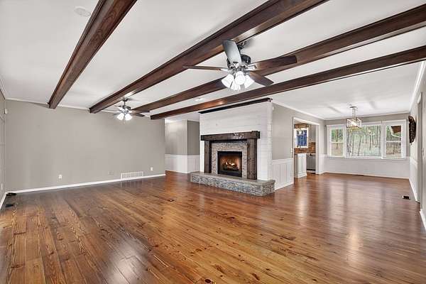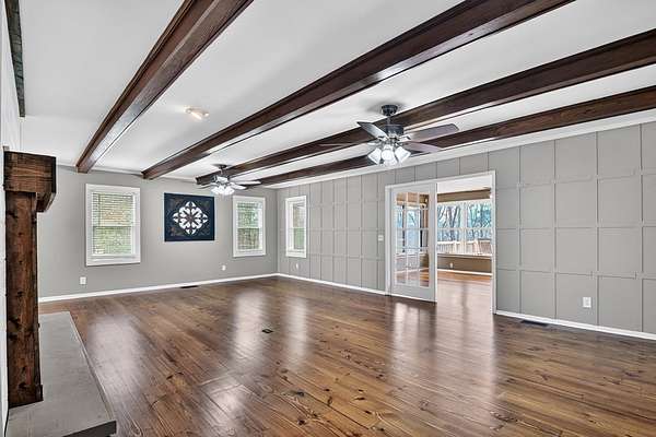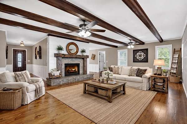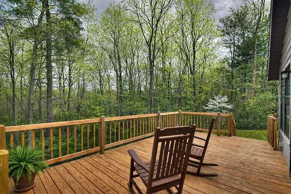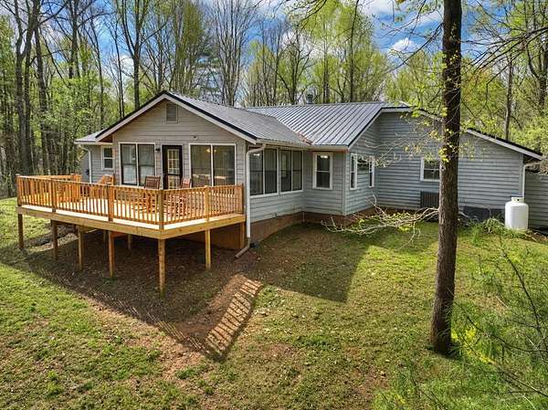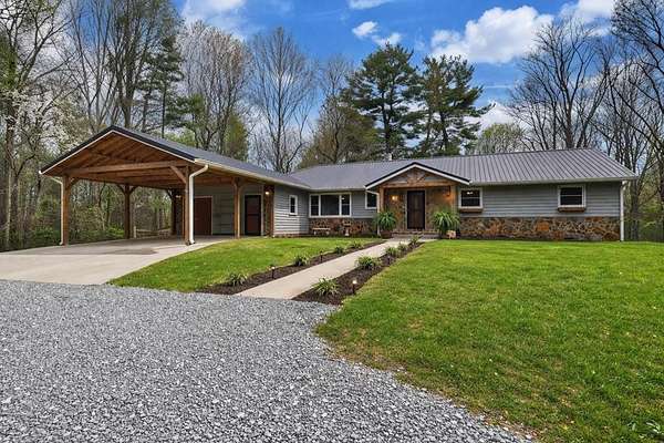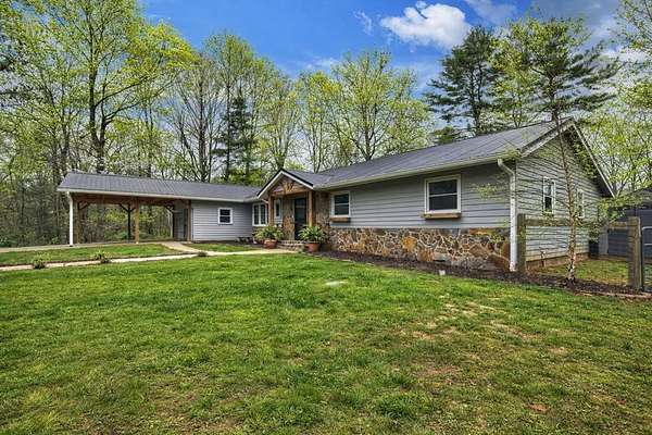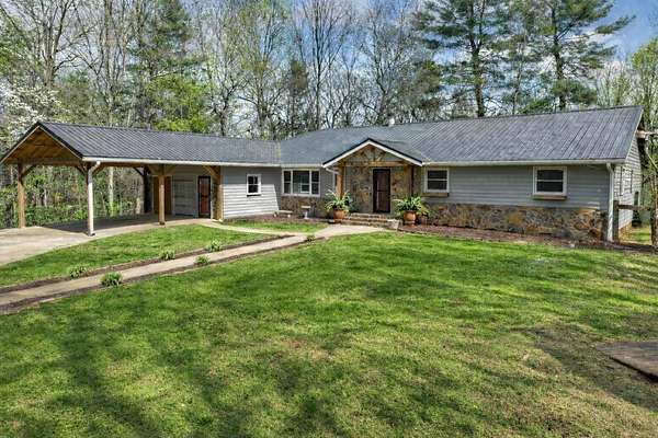 Welcome to this peaceful, beautifully updated 4-bedroom, 3-bath ranch set on 5 private wooded acres with no HOA. This well-appointed home offers the perfect balance of space, comfort, and modern upgrades both inside and out. Step from the covered front porch into a welcoming foyer that opens to an oversized living room featuring a gas log fireplace, beamed ceilings, and stunning new wood flooring throughout. The light-filled sunroom offers walls of windows and flexible space for dining or relaxing, with direct access to a brand-new deck overlooking a large fenced yard—perfect for entertaining or enjoying nature, with seasonal mountain views that could be enhanced with light vista pruning. The living area flows into a spacious dining room and an updated kitchen complete with a large island, granite countertops, white cabinetry, tile backsplash, and newer stainless appliances. All four bedrooms are conveniently located on the main level, including a primary suite with double vanity, large shower, and stylish shiplap accent wall. A separate fourth bedroom suite with kitchenette and full bath offers ideal space for guests or multigenerational living. Just off the carport entry, an oversized mudroom provides the perfect drop zone for everyday convenience and organization. Additional highlights include a main-level laundry and extensive updates such as a new metal roof, HVAC, windows, flooring, septic improvements, fencing, gutters, well pump, water tank, and more. Located just 10 minutes from downtown Ellijay and close to wineries, apple orchards, and hiking trails, this home is a rare opportunity to enjoy peaceful mountain living with modern conveniences.