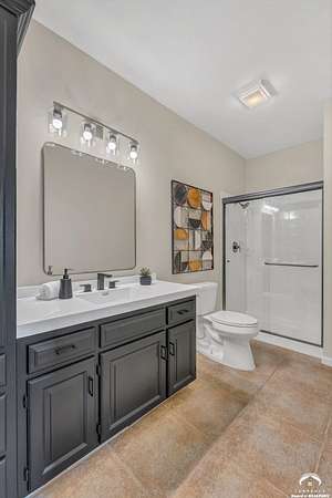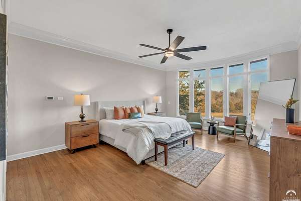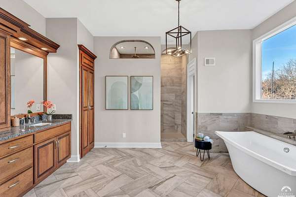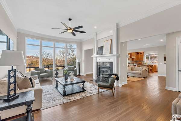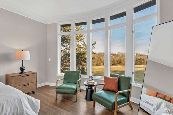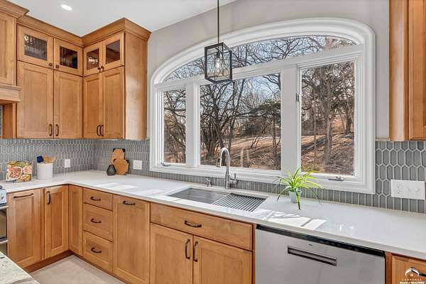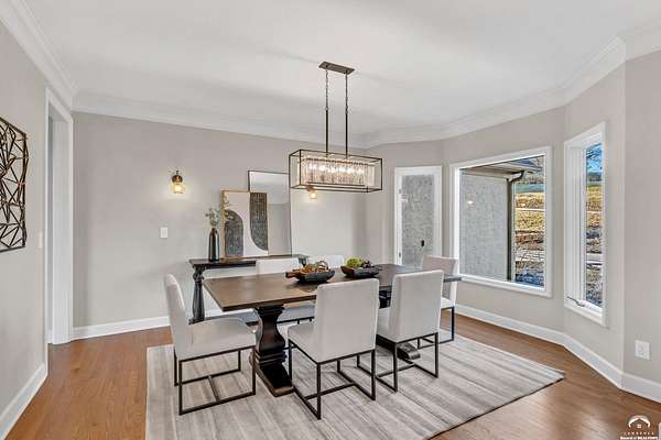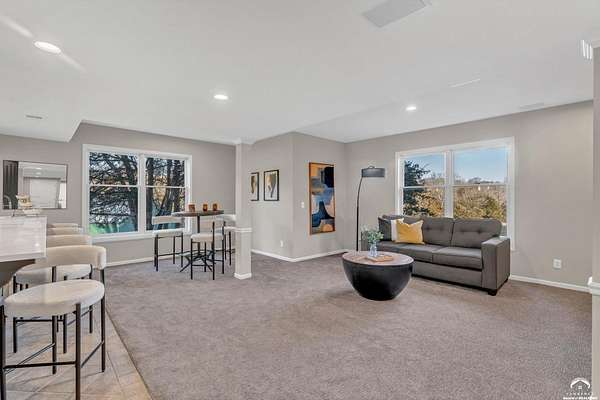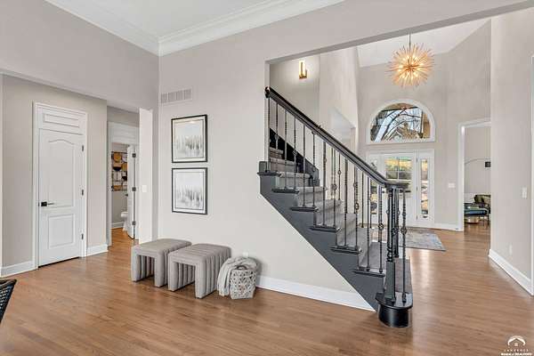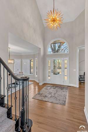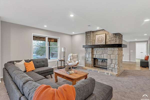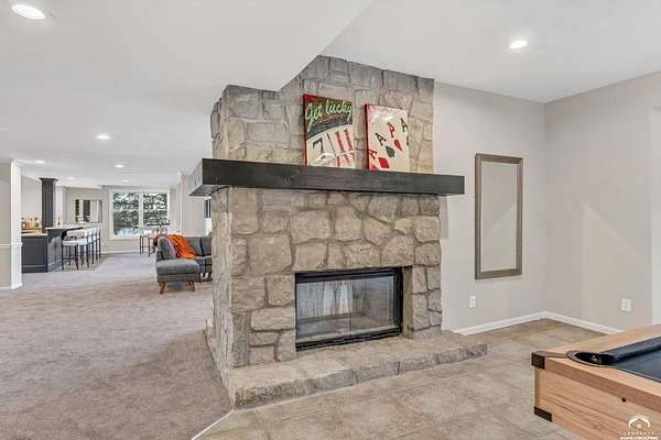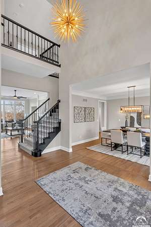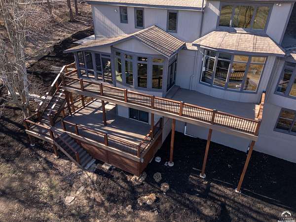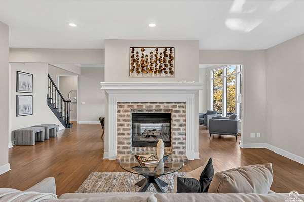 Beautifully updated 5BR, 6 Bath home on 1.78 acres just outside Lawrence, offering sunrise views over open fields and daily wildlife sightings. 6200 sq ft of living space with all new flooring, fresh interior paint, recent grading/landscaping, and modern amenities throughout. The chef's kitchen features GE Cafe appliances, a double oven range, convection microwave, and a large island, opening to spacious living areas with a two sided fireplace. The main level includes generous gathering spaces and a custom primary closet. Two separate staircases lead to the upper level with its own family room. The finished walkout basement adds a huge entertaining area with a wet bar and a second two sided fireplace. Enjoy quiet mornings on the screened in porch or deck overlooking the private acreage. Country feel with upscale comfort just minutes from town, Clinton Lake and the Lawrence Loop.