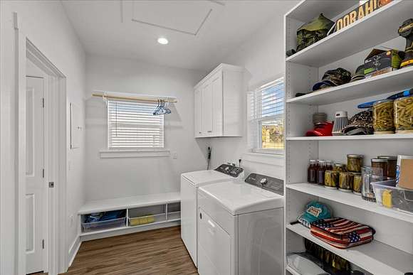 - Alarm System, Blinds, Ceiling Fans, Electric Cook Top, Electric Range, Kitchen/Dining Combo, Laundry/Utility Room, Open Floor Plan, Pantry, Satellite Dish, Smoke Detector, Split Floor Plan, Utility Living Area, Walk-In Closet(s), Whole House Water Filter, Wood Cabinets, w/ Hookups