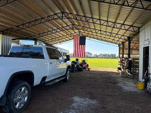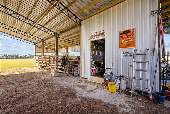 HUGE $25k price reduction! - CHIEFLAND, FLORIDA - BRAND NEW 2024 home on 20.24 acres with additional barn living quarters under expansive 60 x 65 foot pole barn FOR YOU AND YOUR HORSES OR CATTLE ~ Currently 3 stalls in place with tack room/workshop and TONS of extra room for additional stalls, horse trailer, RV, or covered parking. Everything is new, barely lived in, open floor plan with 9+ foot ceilings with beautiful tongue and groove pine wood cathedral ceilings showplace the living area with plenty of room for entertaining. A large picture window over the farm kitchen sink provides a panoramic view of the lush green back pasture while the living room French double-door entry provides a panoramic view of the expansive front pasture. The home is a split floor plan which was well thought out and flows effortlessly from one end of the house to the other. Huge laundry room has lots of built-in storage and connects to guest bathroom and bedroom. All kitchen appliances are stainless steel and include a commercial stove, microwave hood, and dishwasher. A large pantry with lots of shelving and electrical outlets to plug in your cell phone and Milwaukee drill is also a nice feature. The master bedroom has a large walk-in closet and a second closet houses a chest bureau with overhead storage and room to hang long wardrobe items. The custom master bathroom has an enormous walk-in porcelain-tiled shower with dual shower heads and plenty of room for shower controls and hanging towels at shower entry, which is SO convenient! No carpet in home, all flooring is luxury waterproof vinyl planking. Main home A/C is Trane and house has been wired for whole home generator system. The barn living quarters are air-conditioned/heated with mini-split system and includes bedroom area, refrigerator/microwave, and full bathroom with included laundry room encompassing another washer & dryer and hanging closet storage. The sellers actually lived here quite comfortably while their house was being built. An ADT security system is installed in both the main home and barn living quarters. Outside the living quarters is a covered open porch approx 190 sf which is being used as a summer kitchen, barbeque area. There is a small covered patio at the French door entry and a larger covered porch at the kitchen entry with an outdoor shower and walkway which leads to the barn living quarters. There are currently 3 stalls with walkouts to pasture areas. A tack room/workshop is adjacent to the stalls and there is also an additional storage shed with electric. The farm is fully fenced around the perimeter with a locking front gate, and interior cross-fencing is provided with Cashman's Zareba heavy duty rope 10-mile electric fencing making it easy to reconfigure your fencing for rotating pastures. Also includes set up round pen with extra bright LED arena lights. This property is located in an area of other large very nice agricultural properties. Not far from Fowler's Bluff famous Treasure Camp Restaurant and new boat ramp on the Suwannee River. Numerous pristine freshwater springs nearby, approx 10 minutes to Chiefland Walmart, 45 minutes to Gainesville for state of the art medical care, and 45 minutes to Ocala's newest sensation, the World Equestrian Center for the best in equestrian competition and fabulous eateries and shopping! An appointment is needed to see this property because there is so much to see!