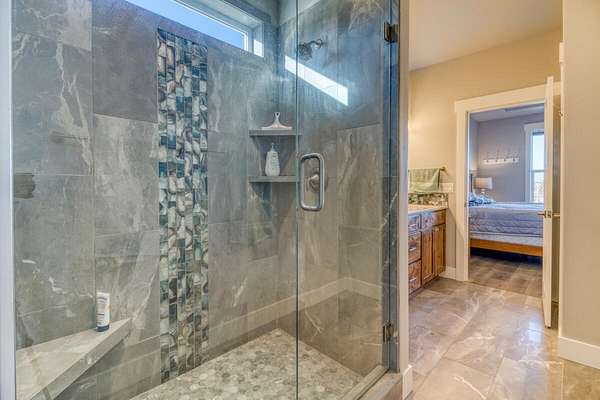 - Ceiling Fan(s), Double Vanity, Fiberglass Stall Shower, Kitchen Island, Linen Closet, Open Floorplan, Pantry, Shower/Tub Combo, Smart Thermostat, Solid Surface Counters, Tile Shower, Walk-In Closet(s)