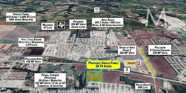 28.74 Acres in Anna's Premier Growth Corridor - Outstanding development opportunity in one of North Texas' fastest-growing cities. This 28.74-acre tract sits directly in the prime growth path of Anna, surrounded by expanding residential communities and continued city infrastructure investment. With strong population trends, demand for new housing, and proximity to major transportation routes, this site is ideal for single-family developers seeking scale and long-term upside.