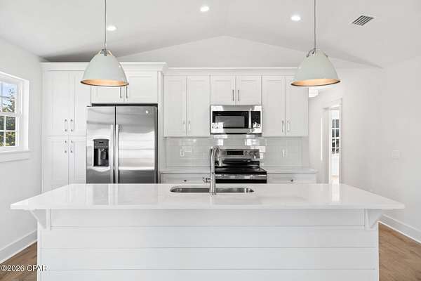 Set to be complete End of January 2026! This thoughtfully designed cottage home in Panama City is a smart move for anyone looking for quality, comfort, and convenience. This 3 bedroom, 2 bathroom open concept floor plan is a great starter home. A one car garage with plenty of storage and an expansive lot for creating your own backyard oasis. Just minutes from Tyndall Air Force Base, public boat ramps, parks, and all the essentials of town, this location offers the best of both peace and practicality. Step inside to vaulted ceilings, tons of natural light, and an open-concept layout that feels spacious yet inviting. The kitchen delivers serious style with sleek quartz countertops, stainless steel appliances, soft-close shaker cabinets, and a large island perfect for hosting or your morning coffee routine. Durable vinyl plank flooring runs throughout. No carpet = no stress or mess. The split-bedroom floor plan gives you privacy where it counts. Outside, enjoy fresh landscaping, a wide driveway, one-car garage, and no HOA, which means no restrictions on your boat, trailer, or weekend toys. Whether you're a first-time buyer, military relocation, or investor looking for a strong rental, this brand-new build checks all the boxes. Don't miss your chance to get into a new home without the wait. Schedule your showing at 929 Bonnie Lane today and see what easy living looks like.