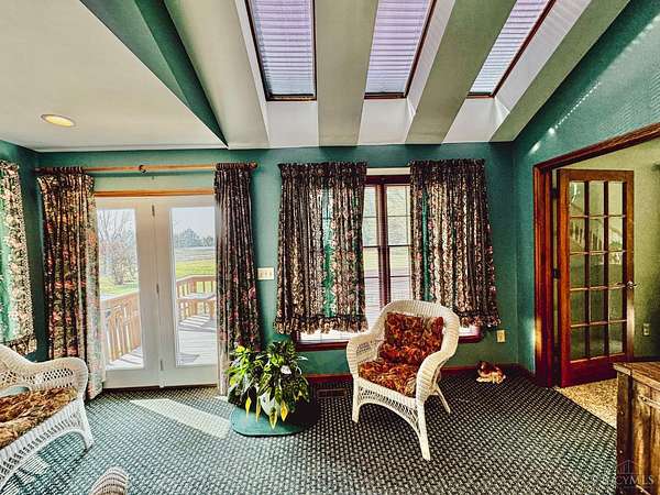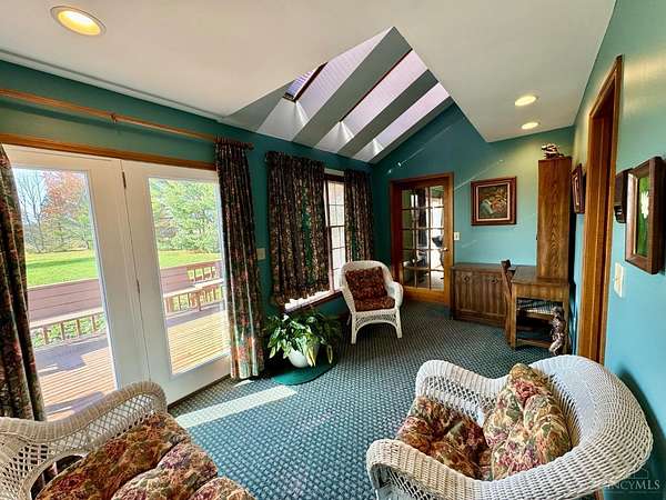 - Beam Ceiling, Cathedral Ceiling, French Doors, Multi Panel Doors, Natural Woodwork, Skylight, Vaulted Ceiling