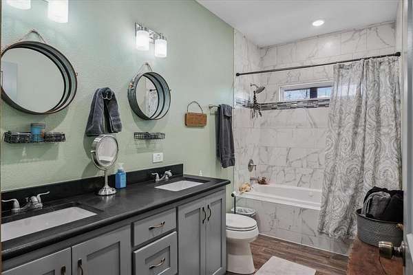 The primary suite offers a private retreat with double vanities, a walk-in closet, and direct access to the back porch overlooking your beautiful property. Two additional bedrooms share a well-appointed guest bath with double sinks.