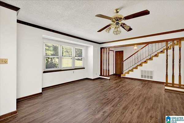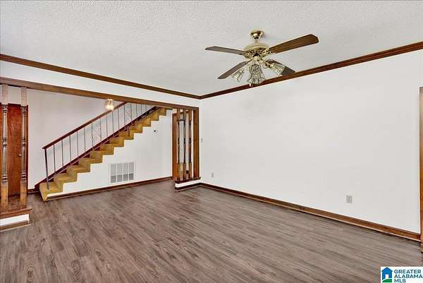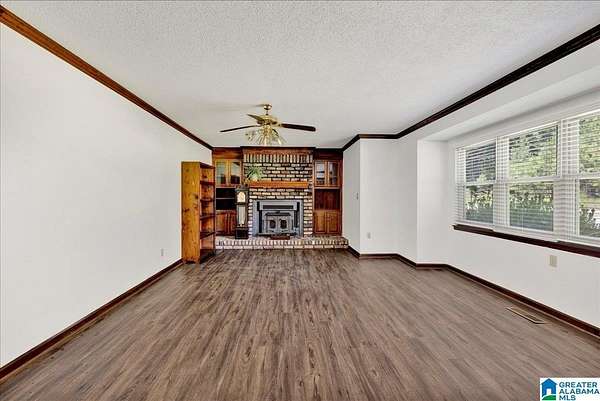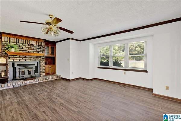 Welcome home to this 3 Bedroom, 2 Bathroom home in Pinson! Upon entering, you will notice TONS of natural light, a wood burning brick fireplace, built in book shelves, NEW FLOORS and FRESH PAINT throughout the main level! The Kitchen offers a large eating area with plenty of cabinet and counter space. The main level Primary Suite is spacious with double closets. You will also find an additional den perfect for a media or play room, as well as a full bathroom with a shower. Upstairs you will find two additional Bedrooms, which share a full Bath with a tub/shower combo. The backyard may be your favorite area, with a massive covered deck looking out at the tranquil wooded setting on 2.5 acres! Schedule your showing today, and make this home yours!